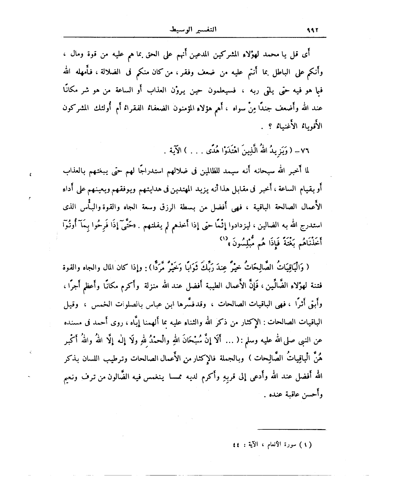 {وَالْبَاقِيَاتُ الصَّالِحَاتُ خَيْرٌ عِنْدَ رَبِّكَ ثَوَابًا وَخَيْرٌ مَرَدًّا}: وإذا كان المال والجاه والقوة فتنة لهؤلاءِ الضَّالِّين، فَإنَّ الأعمال الطيبة أفضل عند الله منزلة وأكرم مكانًا وأعظم أَجرًا، وابقى أَثرًا، فهى الباقيات الصالحات، وقد فسرها ابن عباس بالصلوات الخمس، وقيل الباقيات الصالحات: الأكثار من ذكر الله والثناءِ عليه بما أَلهمنا إيَّاه، روى أحمد في مسنده عن النبي - صلى الله عليه وسلم -: ( ... ألا إِنَّ سُبْحانَ اللهِ والْحمْدُ لِلهِ ولَا إله إلاَّ اللهُ والله أكْبر هُنَّ الْباقِياتُ الصالحات) وبالجملة فالإِكثار من الأعمال الصالحات وترطيب اللسان بذكر الله أَفضل عند الله وأدعى إلى قربِهِ وأكرم لديه مما ينغمس فيه الضَّالون من ترف ونعيم وأَحسن عاقبة عنده.