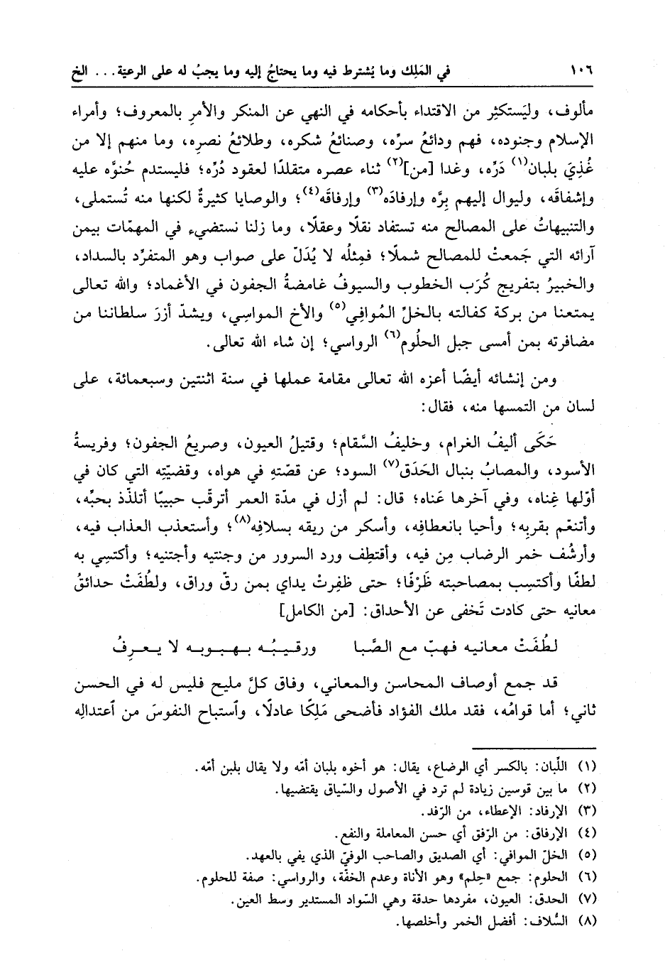 مألوف ، وليستكثر من الاقتداء بأحكامه في النهي عن المنكر والأمر بالمعروف ؛ وأمراء الإسلام وجنوده ، فهم ودائع سره ، وصنائع شكره ، وطلائع نصره ، وما منهم إلا من غذي بلبان دره ، وغدا من ثناء عصره متقلدا لعقود دره ؛ فليستدم حنوه عليهم وإشفاقه ، وليوال إليهم بره وإرفاده وإرفاقه ؛ والوصايا كثيرةٌ لكنها منه تستملى ، والتنبيهات على المصالح منه تستفاد نقلا وعقلا ، وما زلنا نستضيء في المهمات بيمن آرائه التي جمعت للمصالح شملا ؛ فمثله لا يدل على صواب وهو المتفرد بالسداد ، والخبير بتفريج كرب الخطوب والسيوف غامضة الجفون في الأغماد ؛ والله تعالى يمتعنا من بركة كفالته بالخل الموافي والأخ المواسي ، ويشد أزر سلطاننا من مضافرته بمن أمسى جبل الحلوم الرواسي ؛ إن شاء الله تعالى . لاح وإذا رفعت راياته يوم الوغى كبرت بالظفر على ألسنة الرماح ، وإذا كان في جحفلٍ كانت عزائمه للقلب قلبا وصوارمه جناحا للجناح ، وغذا قدر في السلم عفا لكنه في الحرب قليل الصفح بين الصفاح ؛ وهو الذي ما برحت أيدي انتقامه تهدم من أهل الشرك العمائر والأعمار ، وبروق سيوفه تذهب بالنفوس لا بالأبصار ، ويمن يمينه وصبح جبينه هذا يستهل بالأنواء وذا بالأنوار ؛ اقتضى حسن الرأي الشريف أن نوفي حقوق مودته التي أسلفها لنا في كل نعمى وبوسى ، وأن نضاعف علو مكانه من أخوتنا ليكون منا كهارون من موسى ؛ فلذلك رسم بالأمر الشريف العالي المولوي السلطاني الملكي المظفري الركني - لا برح يوفي بعهود الأولياء ويفي ، ويمنح من أخلص النية في ولائه البر الخفي والفضل الحفي - أن تكون كلمة الجناب الكريم العالي الأميري السيفي المشار إليه - أعز الله نصره - نافذةً في كفالة الممالك الإسلامية ، متحكمةً في نيابة السلطنة المعظمة ، وأوامره المطاعة في إمرة الجيوش وحياطة الثغور التي غدت بدوام كفالته متبسمة ؛ على أجمل عوائده ، وأكمل قواعده ؛ نيابةً ثابتة الأساس ، نامية الغراس ؛ لا يضاهى فيها ولا يشارك ، ولا يخرج شيءٌ من أحوالها عن رأيه المبارك ؛ فليبسط نهيه وأمره في التدبير والإحكام ، وليضبط الممالك حتى لا تسامى ولا تسام ؛ وليطلع من آرائه في سماء الملك نجوما بها في المصالح يهتدى ، وليرفع من قواعده ما يخفض به قدر العدا ؛ وليضاعف ما ألفته الأمة من عدله ، وليجر على أكرم عاداته من نشر إنصافه وشمول فضله ، وليعضد جانب الشرع المطهر في عقده وحله ، وتحريمه وحله ؛ ولينفذ كلمته على ما هو من ديانته مألوف ، وليستكثر من الاقتداء بأحكامه في النهي عن المنكر والأمر بالمعروف ؛ وأمراء الإسلام وجنوده ، فهم ودائع سره ، وصنائع شكره ، وطلائع نصره ، وما منهم إلا من غذي بلبان دره ، وغدا من ثناء عصره متقلدا لعقود دره ؛ فليستدم حنوه عليهم وإشفاقه ، وليوال إليهم بره وإرفاده وإرفاقه ؛ والوصايا كثيرةٌ لكنها منه تستملى ، والتنبيهات على المصالح منه تستفاد نقلا وعقلا ، وما زلنا نستضيء في المهمات بيمن آرائه التي جمعت للمصالح شملا ؛ فمثله لا يدل على صواب وهو المتفرد بالسداد ، والخبير بتفريج كرب الخطوب والسيوف غامضة الجفون في الأغماد ؛ والله تعالى يمتعنا من بركة كفالته بالخل الموافي والأخ المواسي ، ويشد أزر سلطاننا من مضافرته بمن أمسى جبل الحلوم الرواسي ؛ إن شاء الله تعالى . ومن إنشائه أيضاً اعزه الله تعالى مقامة عملها في سنة اثنتين وسبعمائة ، على لسان من التمسها منه ، فقال : حكى أليف الغرام ، وحليف السقام ؛ وقتيل العيون ، وصريع الجفون ؛ وفريسة الأسود ، والمصاب بنبال الحدق السود ؛ عن قصته في هواه ، وقضيته التي كان في أولها غناه ، وفي آخرها عناه ؛ قال : لم أزل في مدة العمر أترقب حبيبا أتلذذ بحبه ، وأتنعم بقربه ؛ وأحيا بانعطافه ، وأسكر من ريقه بسلافه ؛ وأستعذب العذاب فيه ، وارشف خمر الرضاب من فيه ، وأقتطف ورد السرور من وجنتيه وأجتنبه ؛ وأكتسي به لطفا ، وأكتسب بمصاحبته ظرفا ؛ حتى ظفرت يداي بمن رق وراق ، ولطفت حدائق معانيه حتى كادت تخفى عن الأحداق