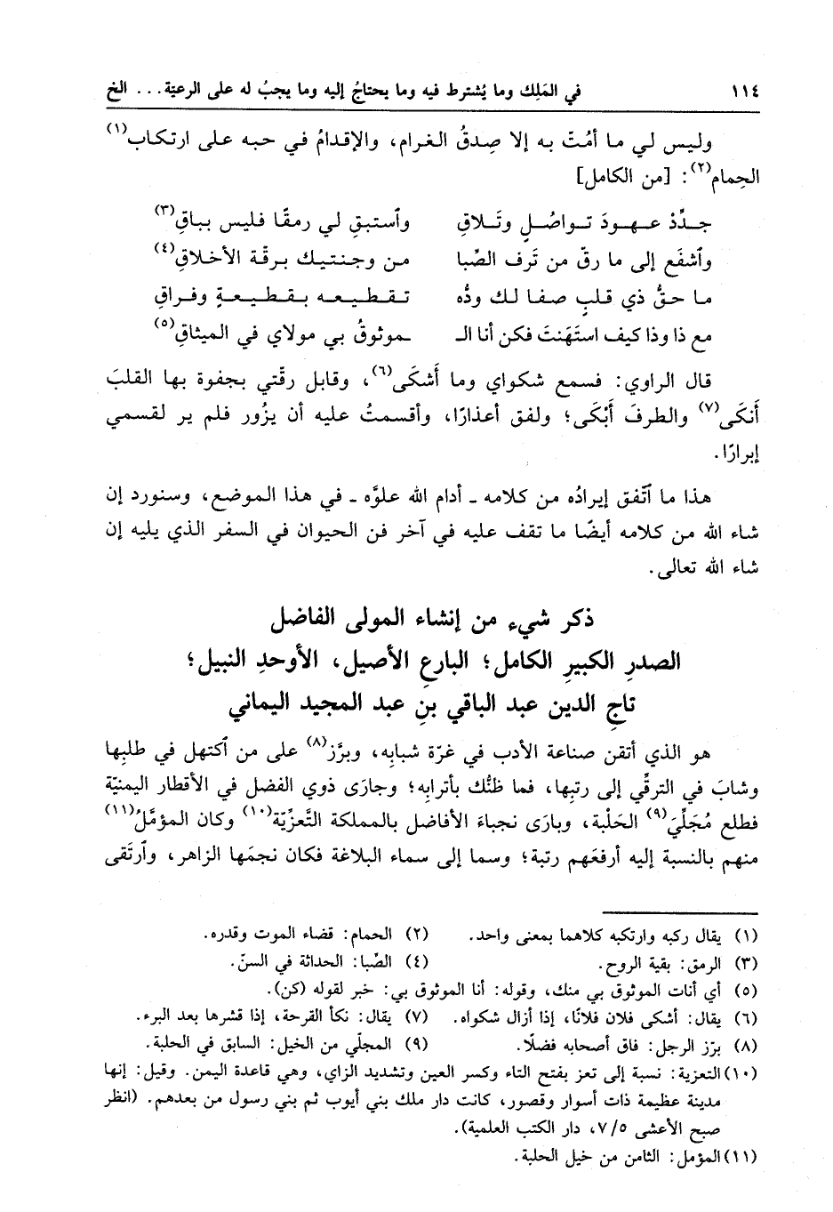 ذكر شيء من إنشاء المولى الفاضل الصدر الكبير الكامل ؛ البارع الأصيل ، الأوحد النبيل ؛ تاج الدين عبد الباقي تاج الدين عبد الباقي بن عبد المجيد اليماني