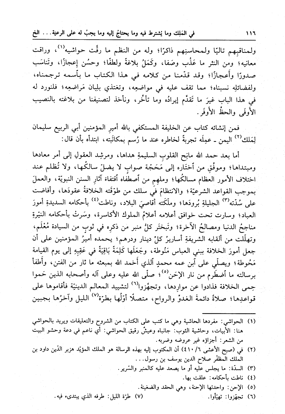 فمن إنشائه كتاب عن الخليفة المستكفي بالله أمير المؤمنين أبي الربيع سليمان لملك اليمن - عمله تجربةً لخاطره عند ما رسم بمكاتبته ، ابتدأه بأن قال : إما بعد حمد ه مانح القلوب السليمة هداها ، ومرشد العقول إلى أمر معادها ومبتداها ؛ وموفق من اختاره إلى محجة صوابٍ لا يضل سالكها ، ولا تظلم عند اختلاف الأمور العظام مسالكها ؛ وملهم من اصطفاه اقتفاء آثار السنن النبويه ، والعمل بموجب القواعد الشرعيه ؛ والانتظام في سلك من طوقته الخلافة عقودها ، وأفاضت على سدته الجليلة برودها ؛ وملكته أقاصي البلاد ، وناطت بأحكامه السديدة أمور العباد ؛ وسارت تحت خوافق أعلامه أعلام الملوك الأكاسره ، وسرت بأحكامه النيرة مناحج الدنيا ومصالح الآخرة ؛ وتبختر كل منبر من ذكره في ثوبٍ من السيادة معلم ، وتهللت من ألقابه الشريفة أسارير كل دينار ودرهم ؛ يحمده أمير المؤمنين على أن جعل أمور الخلافة ببني العباس منوطه ، وجعلها كلمةً باقيةً في عقبه إلى يوم القيامة محوطه ؛ ويصلى على ابن عمه محمدٍ الذي أخمد الله بمبعثه ما ثار من الفتن ، وأطفأ برسالته ما اضطرم من نار الإحن ؛ صلى الله عليه وعلى آله وأصحابه الذين حموا حمى الخلافة فذادوا عن مواردها ، وتجهزوا لتشييد المعالم الدينية فأقاموها على قواعدها ؛ صلاةً دائمة الغدو والرواح ، متصلا أولها بطرة الليل وآخرها بجبين