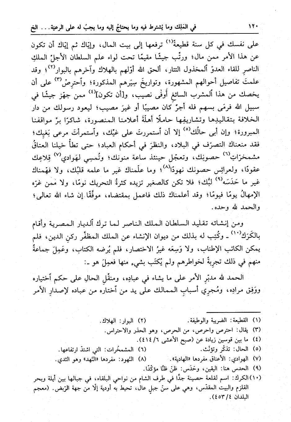 على نفسك في كل سنة قطيعةً ترفعها إلى بيت المال ، وإياك ثم إياك أن تكون عن هذا الأمر ممن مال ؛ ورتب جيشا مقيما تحت لواء علم السلطان الأجل الملك الناصر للقاء العدو المخذول التتار ، ألحق الله أولهم بالهلاك وآخرهم بالبوار ؛ وقد علمت تفاصيل أحوالهم المشهوره ، وتواريخ سيرهم المذكوره ؛ واحترص على أن يخصك من هذا المشرب السائغ أو في نصيب ، وأن تكون ممن جهز جيشا في سبيل الله فرمى بسهم فله أجرٌ كان مصيبا أو غير مصيب ؛ ليعود رسولك من دار الخلافة بتقاليدها وتشاريفها حملا أهلة أعلامنا المنصوره ، شاكرا بر مواقفنا المبروره ؛ وإني أبى حالك إلا أن استمررت على غيك ، واستمرأت مرعى بغيك ؛ فقد منعناك التصرف في البلاد ، والنظر في أحكام العباد ؛ حتى تطأ خيلنا العتاق مشمخرات حصونك ، وتعجل حينئذ ساعة منونك ؛ وتمسي لهوادي قلاعك عقودا ، ولعرائس حصونك نهودا ؛ وما علمناك غير ما علمه قلبك ، ولا فهمناك غير ما حدسه لبك ؛ فلا تكن كالصغير تزيده كثرة التحريك نوما ، ولا ممن غره الإمهال يوما فيوما ؛ وقد أعلمناك ذلك فاعمل بمقتضاه ، موفقا إن شاء الله تعالى ؛ والحمد لله وحده . البيت الحرام ، وقد علمت أنه وادٍ غير ذي زرع ، ولا يحل لأحدٍ أن يتطرق إليه بمنع ؛ وكفتك الآية دليلا على ما صنعت ، وبرهانا على ما فعلت ؛ ومنها انصبابك على تفريغ مال بيت المال في شراء لهو الحديث ، ونقض العهود القديمة بما تبديه من حديث ؛ ومنها تعطيل أجياد المنابر من عقود اسمنا ، وخلو تلك الأماكن من أمر عقدنا وحلنا ؛ ولو أوضحنا لك ما اتصل بنا من أمرك لطال ، ولا اتسعت فيه دائرة المقال ؛ رسمنا بها والسيف يود لو سبق القلم حده ، والعلم المنصور يحب لو فات القلم واهتز بتلك الروابي قده ؛ والكتائب المنصورة تختار لو بدرت عنوان الكتاب وأهل العزم والحزم يودون إليك إعمال الركاب ؛ والجواري المنشآت قد تكونت من ليلٍ ونهار ، وبرزت كصور الفيلة لكنها على وجه الماء كالأطيار ، وما عمدنا إلى مكاتبتك إلى للإنذار ، وما جنحنا لمخاطبتك إلا للإعذار ؛ فأقلع عما أنت بصدده من الخيلاء والإعجاب ، وانتظم في سلك من استخلفناه على أعمالنا فأخذ بيمينه ما أعطي من كتاب ؛ وصن بالطاعة نفوس من زعمت أنهم مقيمون تحت لواء علمك ، ومنتظمون في سلك أوامر كلمك ، وداخلون تحت طاعة قلمك ؛ فلسنا نشن الغارات على من نطق بالشهادتين لسانه وقلبه ، وامتثل أوامر الله المطاعة عقله ولبه ؛ ودان الله بما يجب من الديانه ، وتقلد عقود الصلاح والتحف بمطارف الأمانه ؛ ولسنا ممن يأمر بتجريد سيف إلا على من علمنا أنه خرج عن طاعتنا ، ورفض كتاب الله ونزع عن مبايعتنا ؛ فأصدرنا مرسومنا هذا إليه يقص عليه من أنباء حلمنا ما أطال مدة دولته ، وشيد قواعد صولته ؛ ويستدعى منه رسولا إلى مواقفنا الشريفه ، ورحاب ممالكنا المنيفه ؛ لينوب عنه في قبول الولاية مناب نفسه ، وليجني بعد ذلك ثمار شفقاتنا إن غرس شجر طاعتنا ومن سعادة المرء أن يجني ثمار غراسه ؛ بعد أن يصحبه من ذخائر الأموال ما كثر قيمةً وخف حملا ، وتغالى في القيمة رتبةً وحسن مثلا ؛ واشرط على نفسك في كل سنة قطيعةً ترفعها إلى بيت المال ، وإياك ثم إياك أن تكون عن هذا الأمر ممن مال ؛ ورتب جيشا مقيما تحت لواء علم السلطان الأجل الملك الناصر للقاء العدو المخذول التتار ، ألحق الله أولهم بالهلاك وآخرهم بالبوار ؛ وقد علمت تفاصيل أحوالهم المشهوره ، وتواريخ سيرهم المذكوره ؛ واحترص على أن يخصك من هذا المشرب السائغ أو في نصيب ، وأن تكون ممن جهز جيشا في سبيل الله فرمى بسهم فله أجرٌ كان مصيبا أو غير مصيب ؛ ليعود رسولك من دار الخلافة بتقاليدها وتشاريفها حملا أهلة أعلامنا المنصوره ، شاكرا بر مواقفنا المبروره ؛ وإني أبى حالك إلا أن استمررت على غيك ، واستمرأت مرعى بغيك ؛ فقد منعناك التصرف في البلاد ، والنظر في أحكام العباد ؛ حتى تطأ خيلنا العتاق مشمخرات حصونك ، وتعجل حينئذ ساعة منونك ؛ وتمسي لهوادي قلاعك عقودا ، ولعرائس حصونك نهودا ؛ وما علمناك غير ما علمه قلبك ، ولا فهمناك غير ما حدسه لبك ؛ فلا تكن 