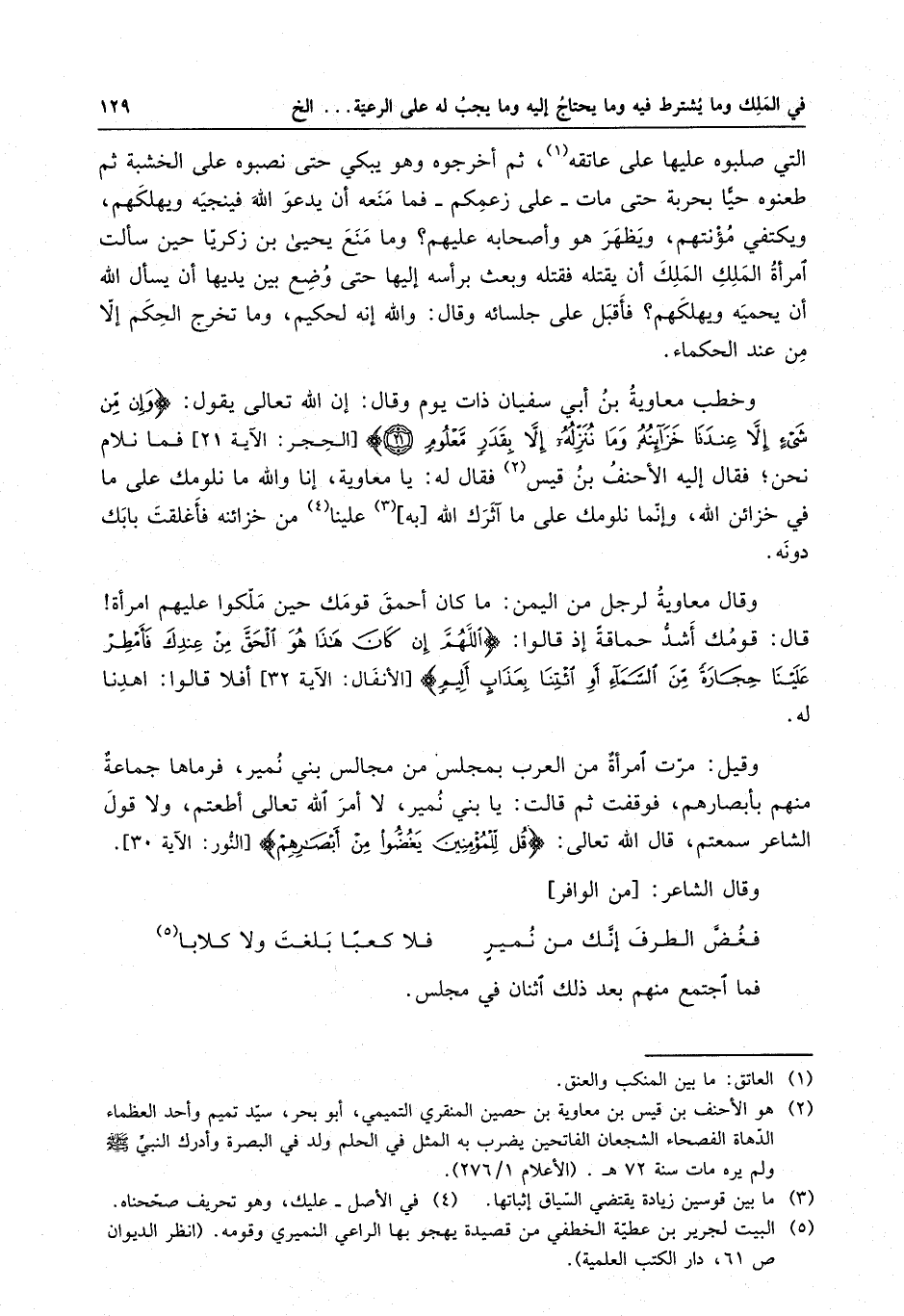 وخطب معاوية بن أبي سفيان ذات يوم وقال : إن الله تعالى يقول : " وإن من شيء إلا عندنا خزائنه وما ننزله إلا بقدرٍ معلومٍ " فما نلام نحن ؛ فقام إليه الأحنف بن قيس فقال له : يا معاوية ، إنا والله ما نلومك على ما في خزائن الله ، وإنما نلومك على ما آثرك الله به علينا من خزائنه فأغلقت بابك دونه .