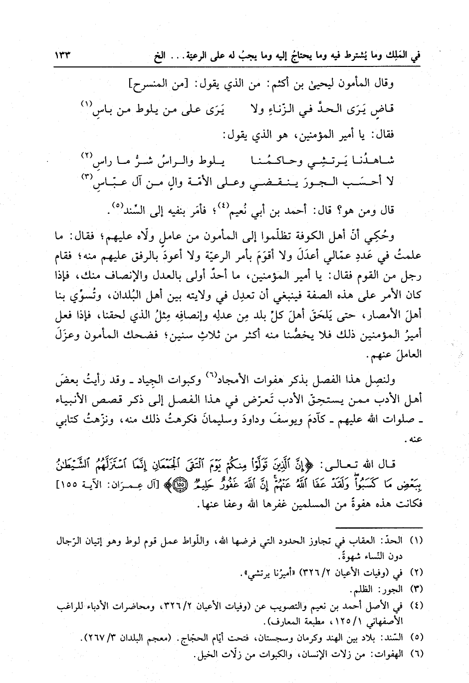 ولنصل هذا الفصل بذكر هفوات الأمجاد وكبوات الجياد - وقد رأيت بعض أهل الأدب ممن يستحق الأدب تعرض في هذا الفصل إلى ذكر قصص الأنبياء - صلوات الله عليهم - كآدم ويوسف وداود وسليمان فكرهت ذلك منه ، ونزهت كتابي عنه - قال الله تعالى : " إن الذين تولوا منكم يوم التقى الجمعان إنما استزلهم الشيطان ببعض ما كسبوا ولقد عفا الله عنهم إن الله غفورٌ حليمٌ " فكانت هذه هفوةً من المسلمين غفرها الله وعفا عنها .