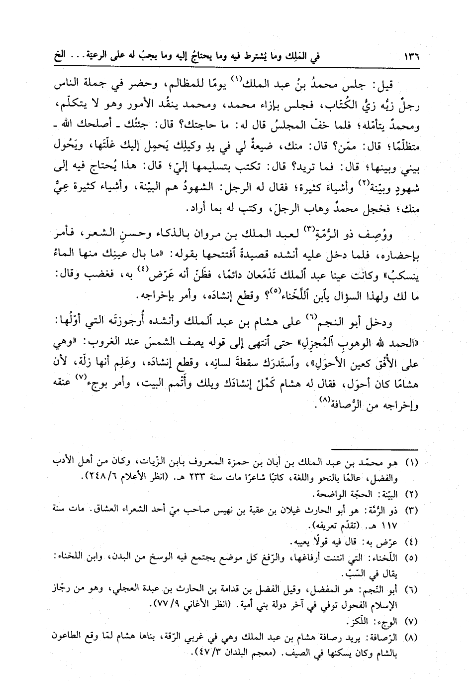 قيل : جلس محمد بن عبد الملك يوما للمظالم ، وحضر في جملة الناس رجلٌ زيه زي الكتاب ، فجلس بإزاء محمد ، ومحمد ينقد الأمور وهو لا يتكلم ، ومحمدٌ يتأمله ؛ فلما خف المجلس قال له : ما حاجتك ؟ قال : جئتك - أصلحك الله - متظلما ؛ قال : ممن ؟ قال : منك ، ضيعةٌ لي في يد وكيلك يحمل إليك غلتها ، ويحول بيني وبينها ؛ قال : فما تريد ؟ قال : تكتب بتسليمها إلي ؛ قال : هذا يحتاج فيه إلى شهودٍ وبينة وأشياء كثيرة ؛ فقال له الرجل : الشهود هم البينة ، وأشياء كثيرة عي ؟ منك ؛ فخجل محمدٌ وهاب الرجل ، وكتب له بما أراد .