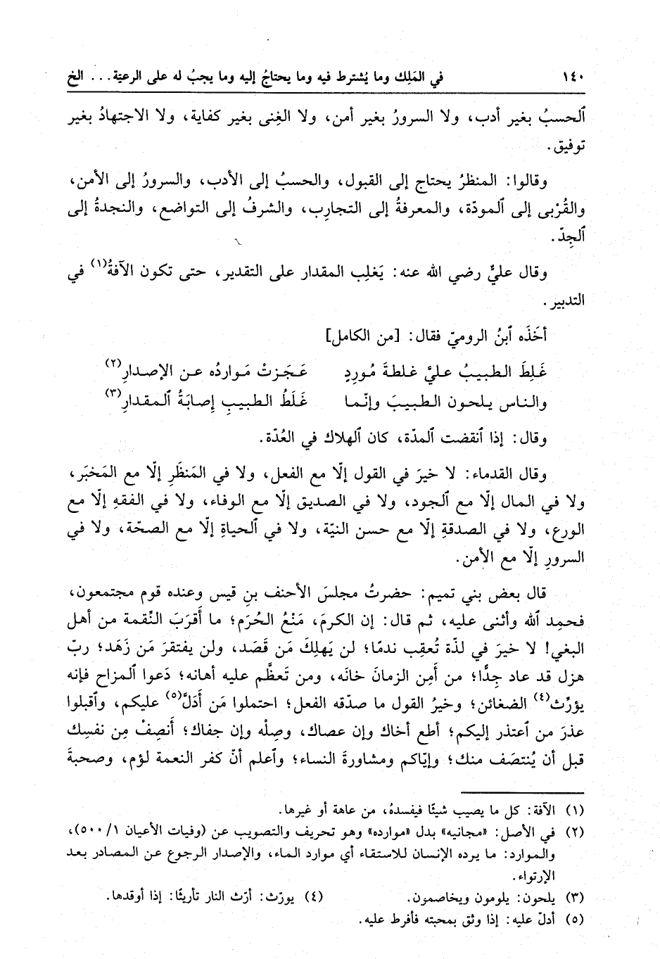 وقالوا : المنظر يحتاج إلى القبول ، والحسب إلى الأدب ، والسرور إلى الأمن ، والقربى إلى المودة ، والمعرفة إلى التجارب ، والشرف إلى التواضع ، والنجدة إلى الجد . وقال علي رضي الله عنه : يغلب المقدار على التقدير ، حتى تكون الآفة في التدبير .