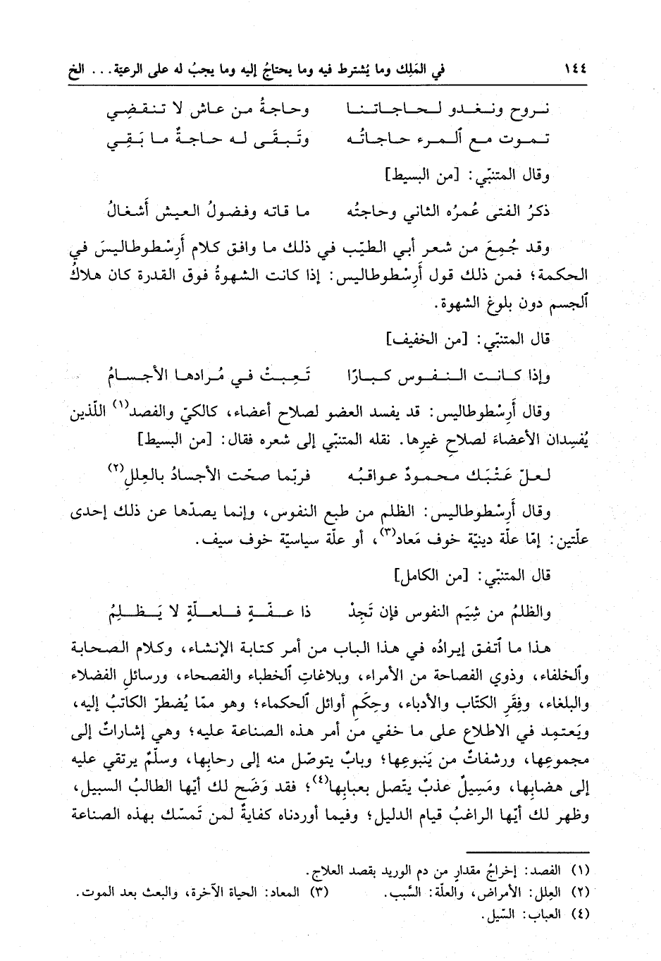 وقد جمع من شعر أبي الطيب في ذلك ما وافق كلام أرسطوطاليس في الحكمة ؛ فمن ذلك قول أرسطوطاليس : إذا كانت الشهوة فوق القدرة كان هلاك الجسم دون بلوغ الشهوة .