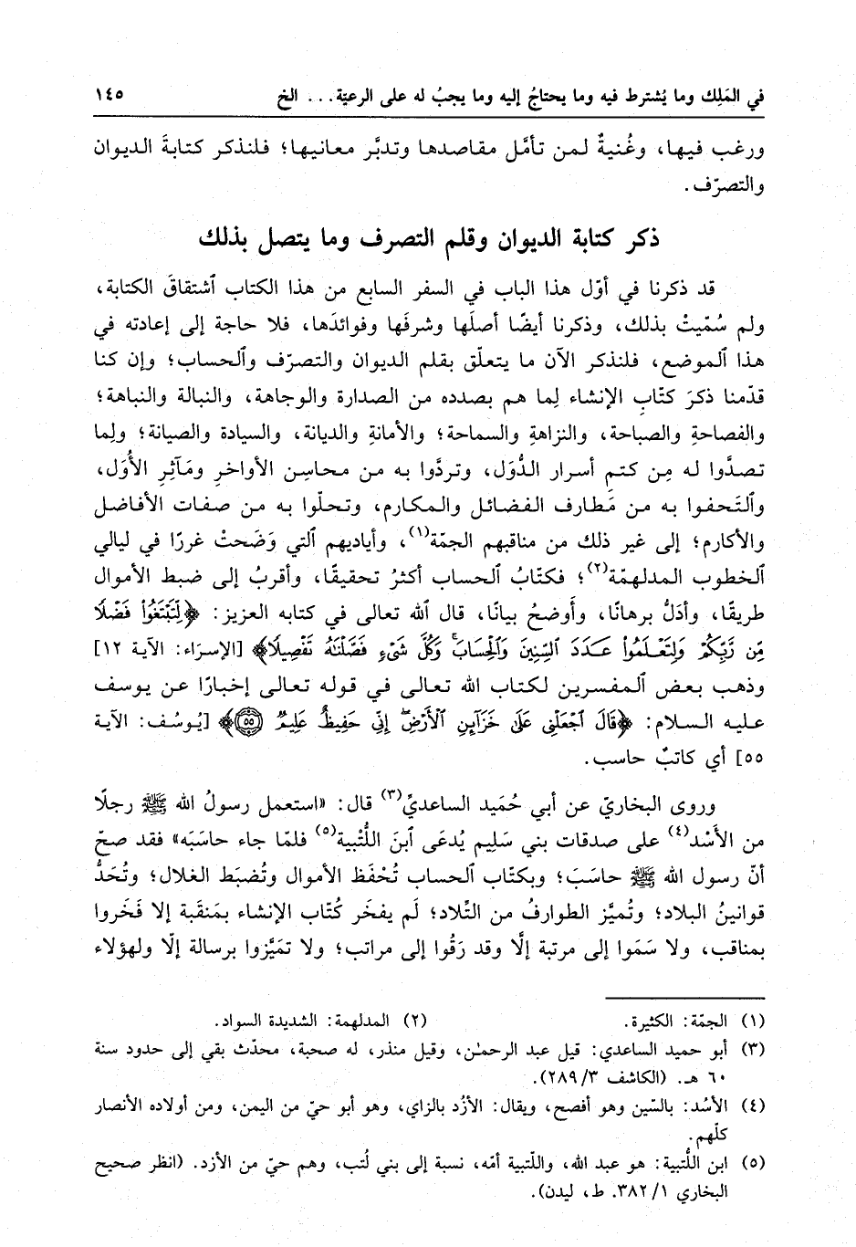 وروى البخاري عن أبي حميد الساعدي قال : " استعمل رسول الله ( صلى الله عليه وسلم ) رجلا من الأسد على صدقات بني سليم يدعى ابن اللتبية فلما جاء حاسبه " فقد صح أن رسول الله ( صلى الله عليه وسلم ) حاسب ؛ وبكتاب الحساب تحفظ الأموال وتضبط الغلال ؛ وتحد قوانين البلاد ؛ وتميز الطوارف من التلاد ؛ لم يفخر كتاب الإنشاء بمنقبة إلا فخروا بمناقب ، ولا سموا إلى مرتبة إلا وقد رقوا إلى مراتب ؛ ولا تميزوا برسالة إلا ولهؤلاء