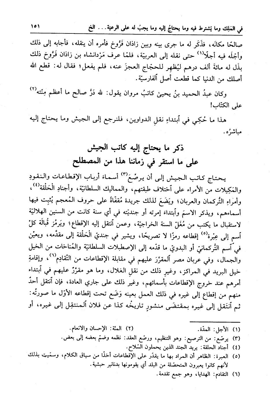 هذا ما حكي في ابتداء نقل الدواوين ، فلنرجع إلى الجيش وما يحتاج إليه مباشره .