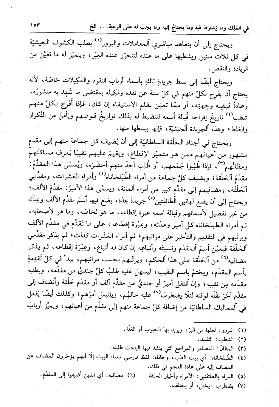 ويحتاج أيضا إلى بسط جريدةٍ ثالثةٍ بأسماء أرباب النقود والمكيلات خاصة ، لأنه يحتاج أن يفرج لكل ؟ منهم في كل سنة عن نقده ومكيله بمقتضى ما شهد به منشوره ، وعادة قبضه وجهته ، أو مما تعين بقلم الاستيفاء إن كان ، فإذا أفرج لكل ؟ منهم شطب تاريخ إفراجه قبالة اسمه لتنضبط له بذلك تواريخ قبوضهم ويأمن من التكرار والغلط ؛ وهذه الجريدة هي فرع من الجريدة الجيشية ، فإنه يبسطها منها . ويحتاج في أجناد الحلقة السلطانية إلى أن يضيف كل جماعة منهم إلى مقدمٍ مشهور من أعيانهم ممن هو متميز الإقطاع ، ويقيم عليها نقيباً يعرف مساكنهم ومظانهم ، فإذا طلبوا جمعهم ، أو طلب أحدٌ منهم أحضره ، ويسمى هذا المقدم : مقدم الحلقة ؛ ويضيف كل جماعة من أمراء الطبلخاناه وأمراء العشرات ، ومقدمي الحلقة ، ومضافيهم إلى مقدمٍ كبير من أمراء المائة ، ويسمى هذا الأمير : مقدم الألف ؛ ويحتاج إلى أن يضع لهاتين الطائفتين جريدة عدة ، يضع فيها اسم مقدم الألف وعدته من غير تفصيل لأسمائهم وقبالة اسمه عبرة إقطاعه ، ما هو لخاصه ، وما هو لأصحابه ؛ ثم أمراء الطبلخاناه كل أمير وعدته ، وعبرة إقطاعه ، على ما تقدم في مقدم الألف ، ويرتبهم في التقديم والتأخير على مراتبهم ؛ ثم أمراء العشرات كذلك ؛ ثم يذكر مقدمي الحلقة فيعين اسم المقدم ونسبته وأتباعه إن كان له أتباع ، وعبرة إقطاعه ، ثم يذكر مضافيه من الحلقة على هذا الحكم ، ويرتبهم بحسب مراتبهم ، يبدأ في كل تقدمةٍ باسم المقدم ، ويختم باسم النقيب ، ليسهل عليه طلب كل جندي ؟ من مقدمه ، ويطلبه مقدمه من نقيبه ؛ وإن انتقل أميرٌ أو جندي ؟ من مقدم ألف أو مقدم حلقة وانضاف إلى مقدمٍ آخر نقله لوقته لئلا يضطرب عليه حالهم ، ويلتبس أمرهم ؛ وكذلك أيضاً يفعل في الممالك السلطانية من إضافة كل جماعة منهم إلى مقدم من أعيانهم ، ويميز أرباب