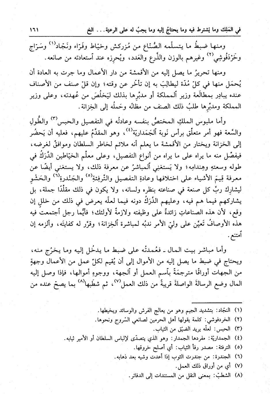 ومنها تحرير ما يصل إليه من الأقمشة من دار الأعمال وما جرت به العادة أن يحمل منها في كل مدة ليطالب به إن تأخر عن وقته ؛ وإن قل صنف من الأصناف عنده يبادر بمطالعة وزير المملكة أو مدبرها بذلك ليخلص من عهدته ، وعلى وزير المملكة ومدبرها طلب ذلك الصنف من مظانه وحمله إلى الخزانة .