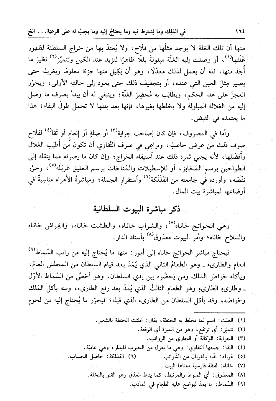 فيحتاج مباشر الحوائج خاناه إلى أمور : منها ما يحتاج إليه من راتب السماط العام والطارئ - وهو الطعام الثاني الذي يمد بعد قيام السلطان من المجلس العام ، ويأكله خواص الملك ومن يحضره بين يدي السلطان ، وهو أخص من السماط الأول - وطارئ الطارئ وهو الطعام الثالث الذي يمد بعد رفع الطارئ ، ومنه يأكل الملك وخواصه ، وقد يأكل السلطان من الطارئ الذي قبله ؛ فيحرر ما يحتاج إليه من لحوم