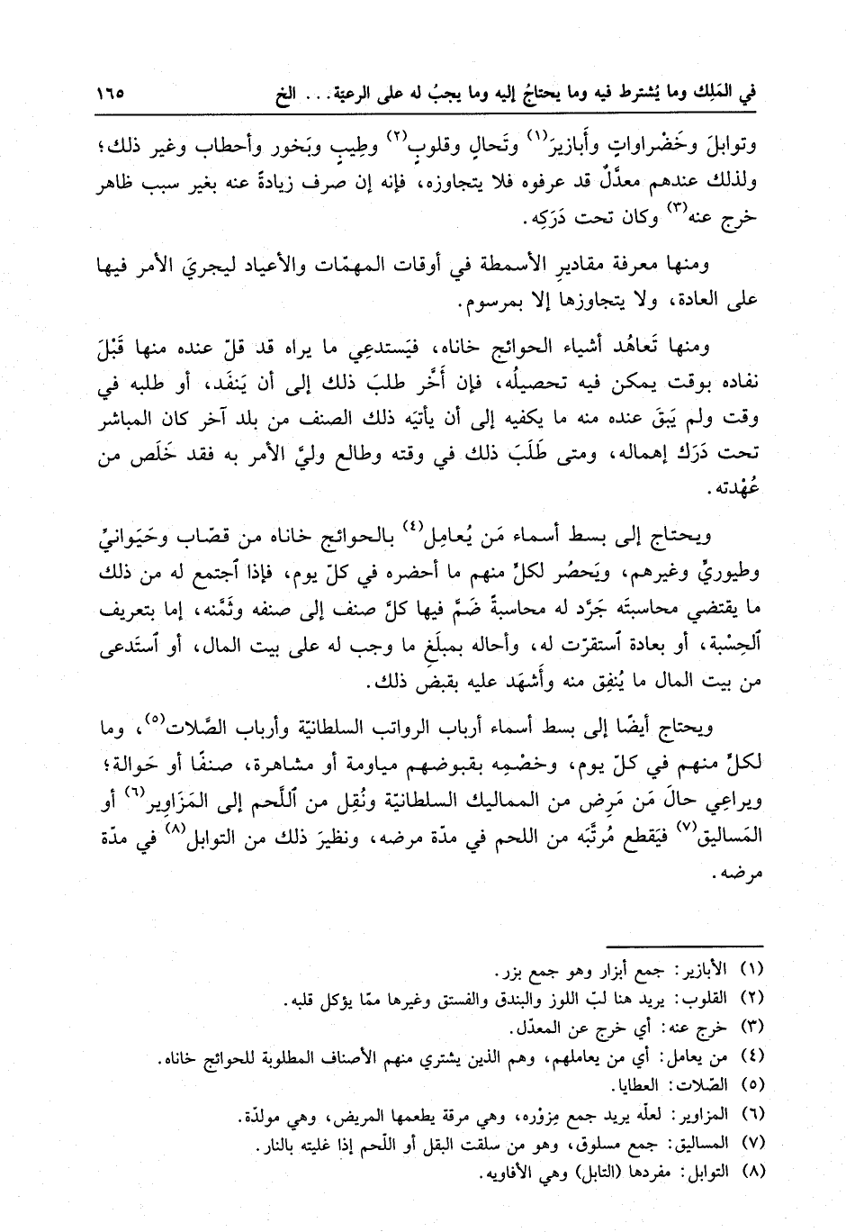 وتوابل وخضراواتٍ وأبازير وتحالٍ وقلوبٍ وطيبٍ وبخور وأحطاب وغير ذلك ؛ ولذلك عندهم معدلٌ قد عرفوه فلا يتجاوزه ، فإنه إن صرف زيادةً عنه بغير سبب ظاهر خرج عنه وكان تحت دركه . ومنها معرفة مقادير الأسمطة في أوقات المهمات والأعياد ليجري الأمر فيها على العادة ، ولا يتجاوزها إلا بمرسوم .