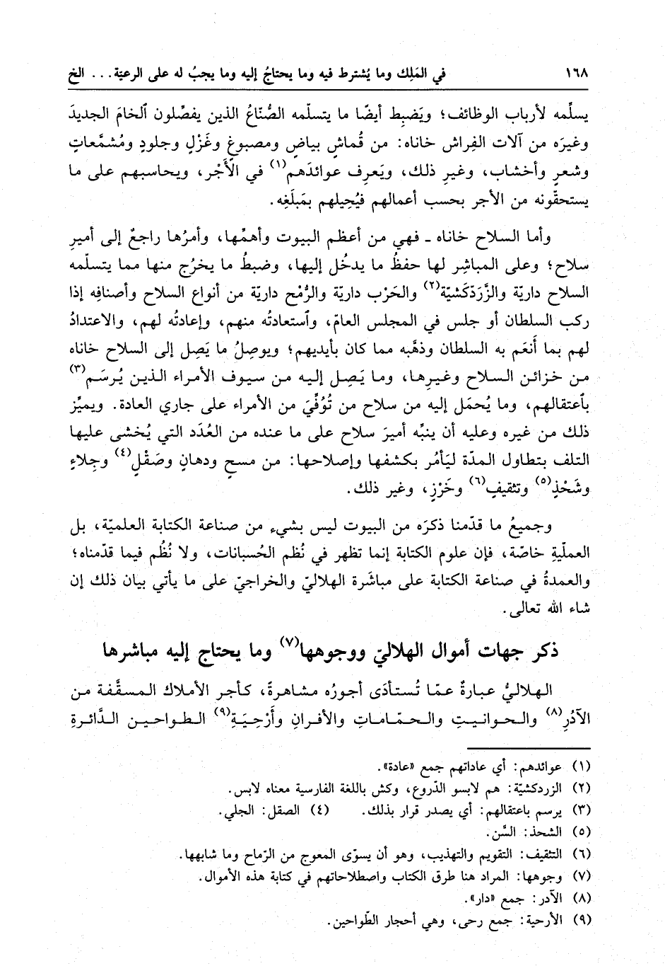 يسلمه لأرباب الوظائف ؛ ويضبط أيضا ما يتسلمه الصناع الذين يفصلون الخام الجديد وغيره من آلات الفراش خاناه : من قماشٍ بياضٍ ومصبوغٍ وغزلٍ وجلودٍ ومشمعاتٍ وشعرٍ وأخشاب ، وغير ذلك ، ويعرف عوائدهم في الأجر ، ويحاسبهم على ما يستحقونه من الأجر بحسب أعمالهم فيحيلهم بمبلغه .