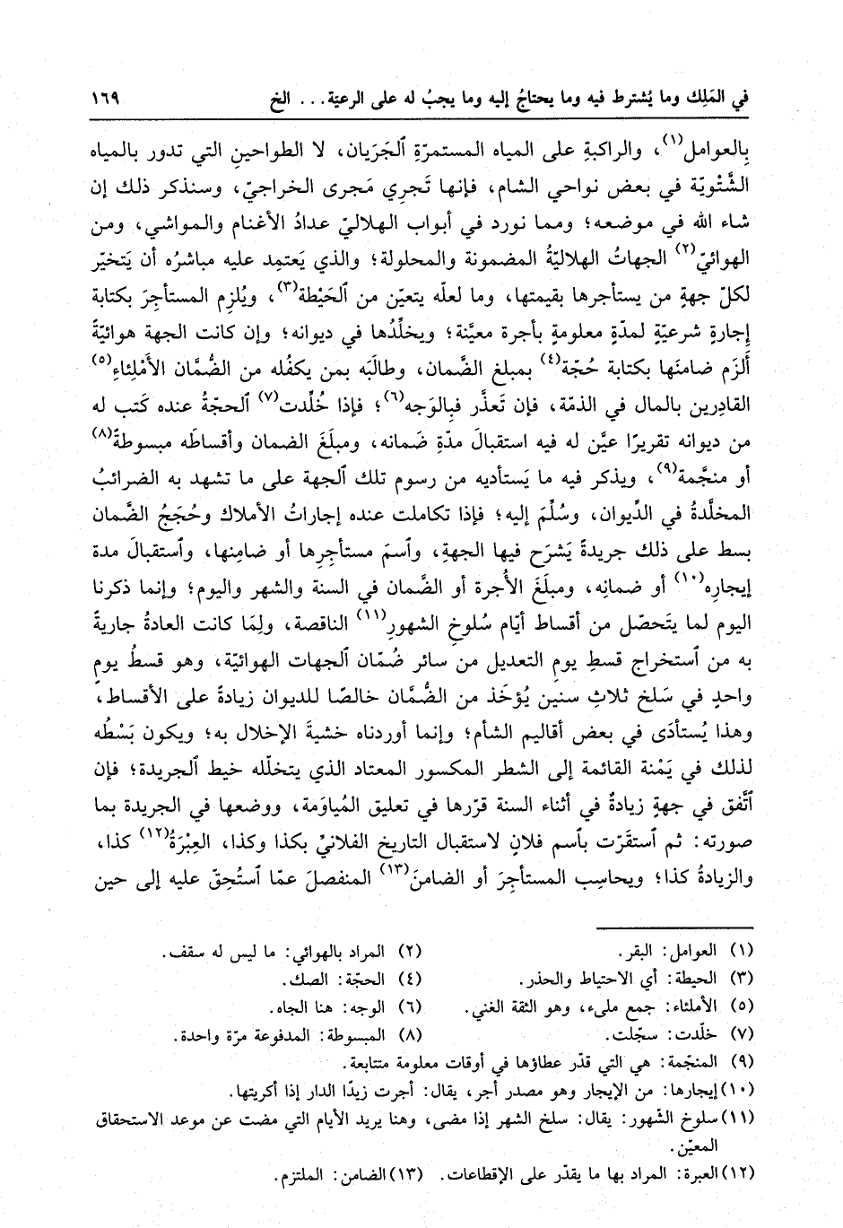 بالعوامل ، والراكبة على المياه المستمرة الجريان ، لا الطواحين التي تدور بالمياه الشتوية في بعض نواحي الشام ، فإنها تجري مجرى الخراجي ، وسنذكر ذلك إن شاء الله في موضعه ؛ ومما نورد في أبواب الهلالي عداد الأغنام والمواشي ، ومن الهوائي الجهات الهلالية المضمونة والمحلولة ؛ والذي يعتمد عليه مباشره أن يتخير لكل جهةٍ من يستأجرها بقيمتها ، وما لعله يتعين من الحيطة ، ويلزم المستأجر بكتابة إجارةٍ شرعيةٍ لمدةٍ معلومةٍ بأجرة معينة ؛ ويخلدها في ديوانه ؛ وغن كانت الجهة هوائيةً ألزم ضامنها بكتابة حجة بمبلغ الضمان ، وطالبه بمن يكفله من الضمان الأملئاء القادرين بالمال في الذمة ، فإن تعذر فبالوجه ؛ فإذا خلدت الحجة عنده كتب له من ديوانه تقريرا عين له فيه استقبال مدة ضمانه ، ومبلغ الضمان وأقساطه مبسوطةً أو منجمة ، ويذكر فيه ما يستأديه من رسوم تلك الجهة علة ما تشهد به الضرائب المخلدة في الديوان ، وسلم إليه ؛ فإذا تكاملت عنده إجارات الأملاك وحجج الضمان بسط على ذلك جريدةً يشرح فيها الجهة ، واسم مستأجرها أو ضامنها ، واستقبال مدة إيجاره أو ضمانه ، ومبلغ الأجرة أو الضمان في السنة والشهر واليوم ؛ وإنما ذكرنا اليوم لما يتحصل من أقساط أيام سلوخ الشهور الناقصة ، ولما كانت العادة جاريةً به من استخراج قسط يوم التعديل من سائر ضمان الجهات الهوائية ، وهو قسط يومٍ واحدٍ في سلخ ثلاث سنين يؤخذ من الضمان خالصا للديوان زيادةً على الأقساط ، وهذا يستأدى في بعض أقاليم الشأم ؛ وإنما أوردناه خشية الإخلال به ؛ ويكون بسطه لذلك في يمنة القائمة إلى الشطر المكسور المعتاد الذي يتخلله خيط الجريدة ؛ فإن اتفق في جهةٍ زيادةٌ في أثناء السنة قررها في تعليق المياومة ، ووضعها في الجريدة بما صورته : ثم استقرت باسم فلانٍ لاستقبال التاريخ الفلاني بكذا وكذا ، العبرة كذا ، والزيادة كذا ؛ ويحاسب المستأجر أو الضامن المنفصل عما استحق عليه إلى حين