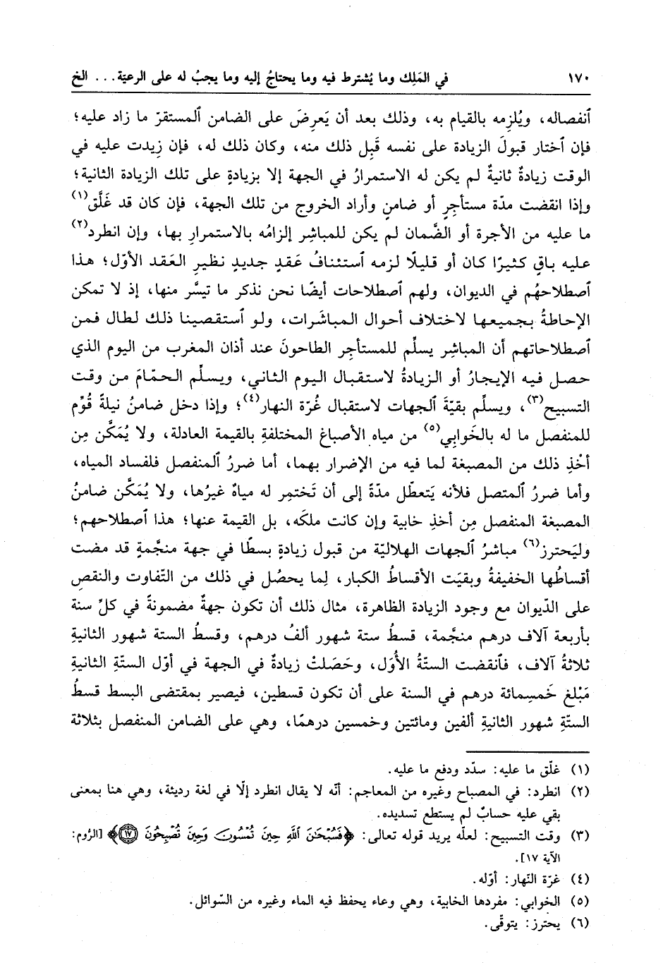 انفصاله ، ويلزمه بالقيام به ، وذلك بعد أن يعرض على الضامن المستقر ما زاد عليه ، فإن اختار قبول الزيادة على نفسه قبل ذلك منه ، وكان ذلك له ، فإن زيدت عليه في الوقت زيادةٌ ثانيةٌ لم يكن له الاستمرار في الجهة إلا بزيادة على تلك الزيادة الثانية ؛ وإذا انقضت مدة مستأجرٍ أو ضامنٍ وأراد الخروج من تلك الجهة ، فإن كان قد غلق ما عليه من الأجرة أو الضمان لم يكن للمباشر إلزامه بالاستمرار بها ، وإن انطرد عليه باقٍ كثيرا كان أو قليلا لزمه استئناف عقدٍ جديدٍ نظير العقد الأول ؛ هذا اصطلاحهم في الديوان ، ولهم اصطلاحات أيضا نحن نذكر ما تيسر منها ، إذ لا تمكن الإحاطة بجميعها لاختلاف أحوال المباشرات ، ول استقصينا ذلك لطال ؛ فمن اصطلاحاتهم أن المباشر يسلم للمستأجر الطاحون عند أذان المغرب من اليوم الذي حصل فيه الإيجاز أو الزيادة لاستقبال اليوم الثاني ، ويسلم الحمام من وقت التسبيح ، ويسلم بقية الجهات لاستقبال غرة النهار ؛ وإذا دخل ضامن نيلةٍ قوم للمنفصل ماله بالخوابي من مياه الأصباغ المختلفة بالقيمة العادلة ، ولا يمكن من أخذ ذلك من المصبغة لما فيه من الإضرار بهما ، أما ضرر المنفصل فلفساد المياه ، وأما ضرر المتصل فلأنه يتعطل مدةً إلى أن تختمر له مياهٌ غيرها ، ولا يمكن ضامن المصبغة المنفصل من أخذ خابية وإن كانت ملكه ، بل القيمة عنها ؛ هذا اصطلاحهم ؛ وليحترز مباشر الجهات الهلالية من قبول زيادةٍ بسطا في جهة منجمةٍ قد مضت أقساطها الخفيفة وبقيت الأقساط الكبار ، لما يحصل في ذلك من التفاوت والنقص على الديوان مع وجود الزيادة الظاهرة ، مثال ذلك أن تكون جهةٌ مضمونةً في كل سنة بأربعة آلاف درهم منجمة ، قسط ستة شهور ألف درهم ، وقسط الستة شهور الثانية ثلاثة آلاف ، فانقضت الستة الأول ، وحصلت زيادةٌ في الجهة في أول الستة الثانية مبلغ خمسمائة درهم في السنة على أن تكون قسطين ، فيصير بمقتضى البسط قسط الستة شهور الثانية ألفين ومائتين وخمسين درهما ، وهي على الضامن المنفصل بثلاثة