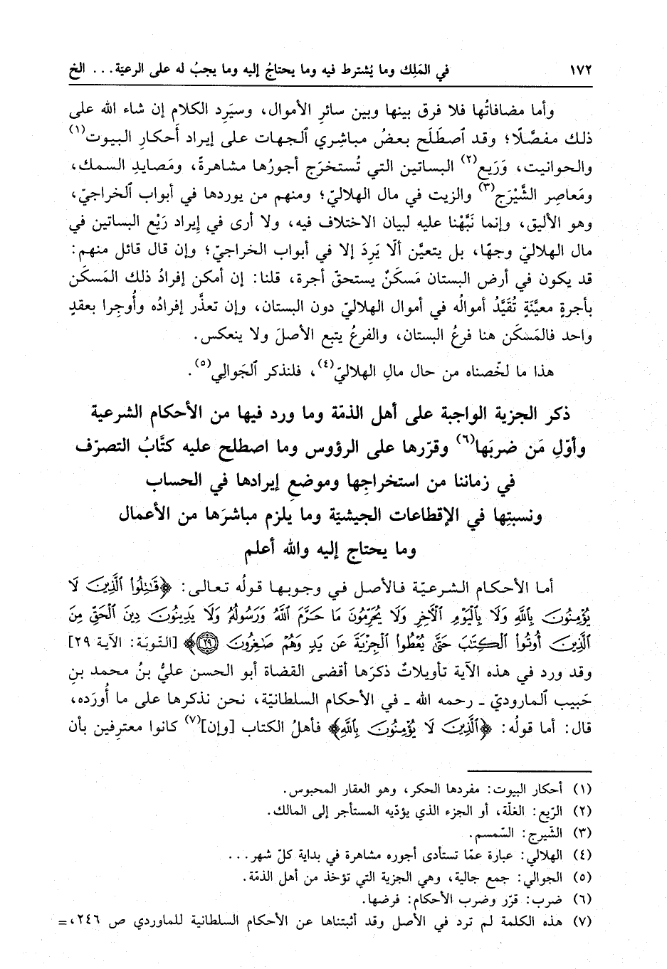ذكر الجزية الواجبة على أهل الذمة وما ورد فيها من الأحكام الشرعية وأول من ضربها وقررها على الرؤوس وما اصطلح عليه كتاب التصرف في زماننا من استخراجها وموضع إيرادها في الحساب ونسبتها في الإقطاعات الجيشية وما يلزم مباشرها من الأعمال وما يحتاج إليه والله أعلم