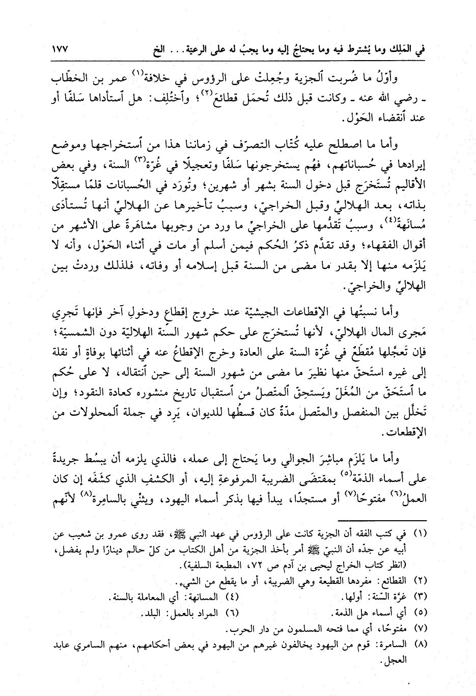 وأول ما ضربت الجزية وجعلت على الرؤوس في خلافة عمر بن الخطاب - رضي الله عنه - وكانت قبل ذلك تحمل قطائع ؛ واختلف : هل استأداها سلفا أو عند انقضاء الحول .