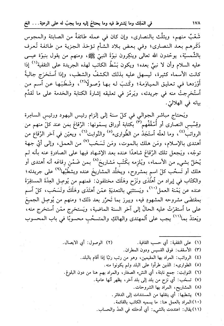 ويحتاج مباشر الجوالي في كل سنة إلى إلزام رئيس اليهود ورئيس السامرة وقسيس النصارى أو أسقفهم بكتابة أوراق يسمونها : الرقاع بمن عند كل منهم من الرواتب ، وما لعله استجد من الطوارئ والنوابت ، ويعين في آخر الرقاع من اهتدى بالإسلام ، ومن هلك بالموت ، ومن تسحب من العمل ، وإلى أي جهة توجه ، ويجعل تلك الرقاع شاهدا عنده بعد الإشهاد فيها على الصادرة عنه بأنه لم يخل بشيء من الأسماء ، ويلزمه بكتب مشاريح بمن ضمن رقاعه أنه اهتدى أو هلك أو تسحب كل اسمٍ بمشروح ، ويخلد المشاريح عنده ويشطبها على جريدته ؛ والكتاب في إيراد من اهتدى ونزح وهلك مختلفون : فمنهم من يوصل العدة المستقرة عنده عن يمنة العمل ، ويستثنى بالتعدية عمن اهتدى وهلك وتسحب ، كل اسم بمقتضى مشروحه المشهود فيه ، ويبرز بما تحرر بعد ذلك ؛ ومنهم من يوصل الجميع على ما استقرت عليه الحال إلى آخر السنة الماضية ، ويستخرج ممن استخرج منه ، ويعتد بما يجب على المهتدى والهالك والمتسحب محسوبا في باب المحسوب