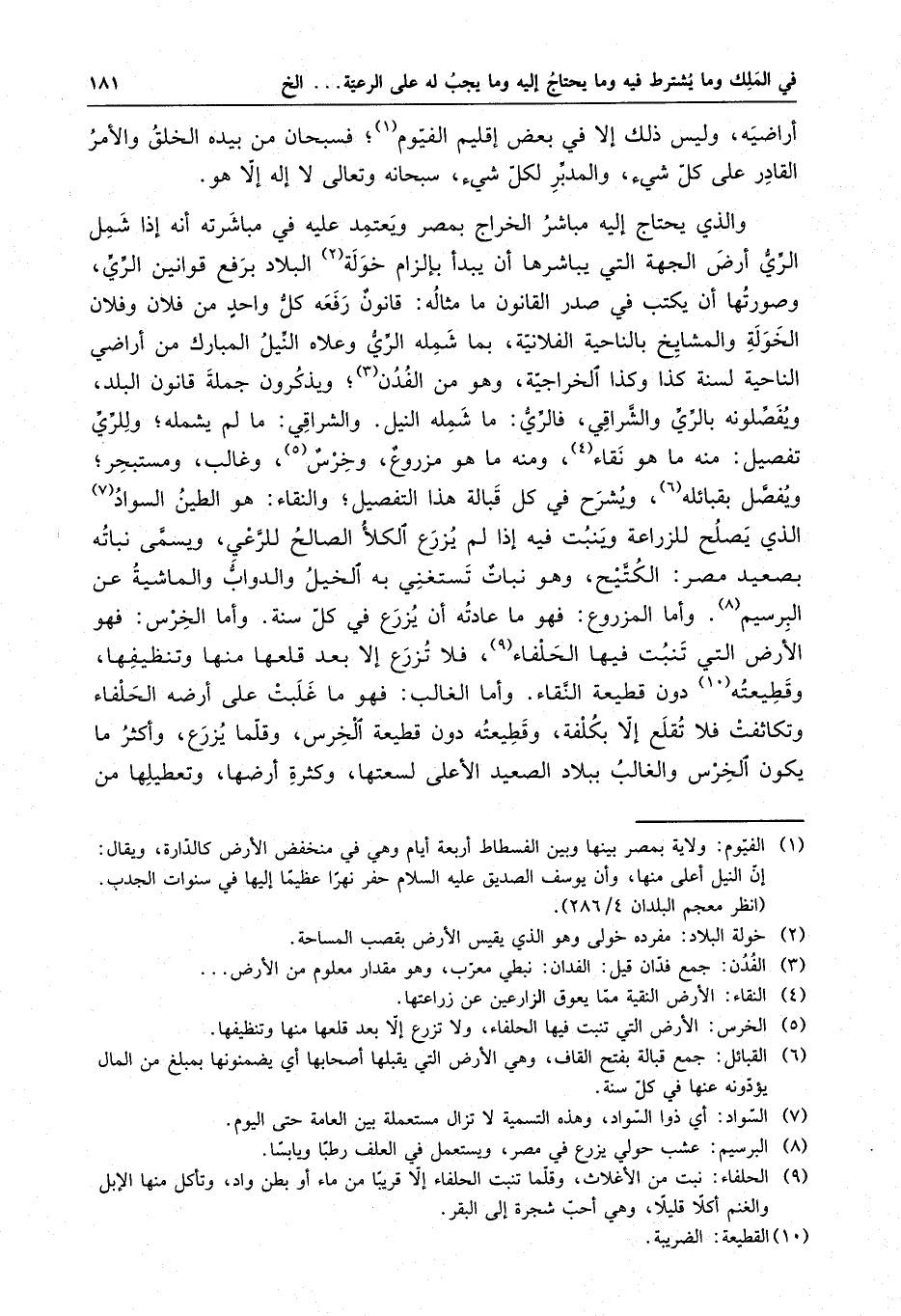 أراضيه ، وليس ذلك إلا في بعض إقليم الفيوم ؛ فسبحان من بيده الخلق والأمر القادر على كل شيء ، والمدبر لكل شيء ، سبحانه وتعالى لا إله إلا هو . والذي يحتاج إليه مباشر الخراج بمصر ويعتمد عليه في مباشرته أنه إذا شمل الري أرض الجهة التي يباشرها أن يبدأ بإلزام خولة البلاد برفع قوانين الري ، وصورتها أن يكتب في صدر القانون ما مثاله : قانونٌ رفعه كل واحدٍ من فلان وفلان الخولة والمشايخ بالناحية الفلانية ، بما شمله الري وعلاه النيل المبارك من أراضي الناحية لسنة كذا وكذا الخراجية ، وهو من الفدن ؛ ويذكرون جملة قانون البلد ، ويفصلونه بالري والشراقي ، فالري : ما شمله النيل . والشراقي : ما لم يشمله ؛ وللري تفصيل : منه ما هو نقاء ، ومنه ما هو مزروعٌ ، وخرسٌ ، وغالب ، ومستبحر ؛ ويفصل بقبائله ، ويشرح في كل قبالة هذا التفصيل ؛ والنقاء : هو الطين السواد الذي يصلح للزراعة وينبت فيه إذا لم يزرع الكلأ الصالح للرعي ، ويسمى نباته بصعيد مصر : الكتيح ، وهو نباتٌ تستغني به الخيل والدواب والماشية عن البرسيم . وأما المزروع : فهو ما عادته أن يزرع في كل سنة . وأما الخرس : فهو الأرض التي تنبت فيها الحلفاء ، فلا تزرع إلا بعد قلعها منها وتنظيفها ، وقطيعته دون قطيعة النقاء . وأما الغالب : فهو ما غلبت على أرضه الحلفاء وتكاثفت فلا تقلع إلا بكلفة ، وقطيعته دون قطيعة الخرس ، وقلما يزرع ، وأكثر ما يكون الخرس والغالب ببلاد الصعيد الأعلى لسعتها ، وكثرة أرضها ، وتعطيلها من