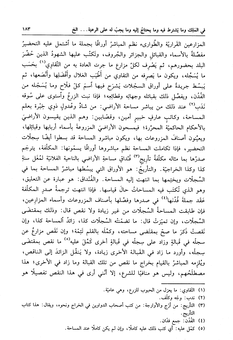 المزارعين القرارية والطوارئ نظم المباشر أوراقا بجملة ما اشتمل عليه التحضير مفصلةً بالأسماء والقبائل والجزائر والجروف ، وتكتب عليها الشهود الذين حضر البلد بحضورهم ، ثم يصرف لكل مزارع ما جرت العادة به من التقاوي بحسب ما يسجله ، ويكون ما يصرفه من التقاوي من أطيب الغلال وأفضلها وأنصعها ، ثم يبسط جريدةً على أوراق السجلات يشرح فيها اسم كل فلاح وما يسجله من الفدن ، ويفصل ذلك بقبائله وجهاته وقطائعه ؛ فإذا نبت الزرع واستوى على سوقه ندب عند ذلك من يباشر مساحة الأراضي : من شاد ؟ وعدولٍ ذوي خبرة بعلم المساحة ، وكاتبٍ عارفٍ خبيرٍ أمين ، وقصابين : وهم الذين يقيسون الأراضي بالأحكام الحاكمية المحررة ؛ فيمسحون الأراضي المزروعة بأسماء أربابها وقبائلها ، ويعينون أصناف المزروعات بها ، ويكون مباشرو المساحة قد بسطوا أيضا سجلات التحضير ، فإذا تكاملت المساحة نظم مباشروها أوراقا يسمونها : المكلفة ، يترجم صدرها بما مثاله مكلفة تأريج فنداق مساحة الأراضي بالناحية الفلانية لمغل سنة كذا وكذا الخراجية . والتأريج : هو الأوراق التي يبسطها مباشر المساحة بما في السجلات ويختمها بما انتهت إليه المساحة . والفنداق : هو عبارة عن التعليق ، وهو الذي تكتب فيه المساحات حال قياسها . فإذا انتهت ترجمة صدر المكلفة عقد جملة فدنها في صدرها وفصلها بأصناف المزروعات وأسماء المزارعين ، فإن طابقت المساحة السجلات من غير زيادة ولا نقص قال : وذلك بمقتضى السجلات ، وإن تميزت قال : ما تضمنته السجلات كذا ، زائد المساحة كذا ، وإن نقصت ذكر ما صح بمقتضى مساحته ، وكمله بالقلم تتمة ؛ وإن نقص مزارعٌ عن سجله في قبالةٍ وزاد على سجله في قبالةٍ أخرى كمل عليه ما نقص بمقتضى سجله ، وأورد ما زاد في القبالة الأخرى زيادة ، ولا ينقل الزائد إلى الناقص ، ويلزمه المباشر بالقيام بخراج ما نقص من تلك القبالة وما زاد في الأخرى ؛ هذا مصطلحهم ، وليس هو منافيا للشرع ، إلا أنني أرى في هذا النقص تفصيلا هو