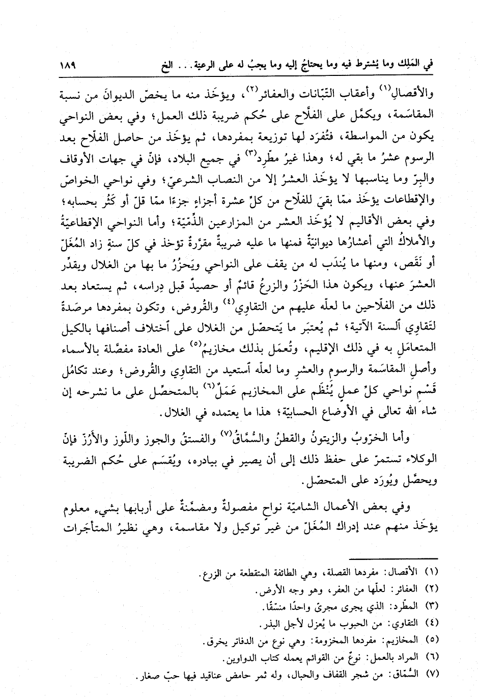 والأقصال وأعقاب التبانات والعفائر ، ويؤخذ منه ما يخص الديوان من نسبة المقاسمة ، ويكمل على الفلاح على حكم ضريبة ذلك العمل ؛ وفي بعض النواحي يكون من المواسطة ، فتفرد لها توزيعةٌ بمفردها ، ثم يؤخذ من حاصل الفلاح بعد الرسوم عشر ما بقي له ؛ وهذا غير مطرد في جميع البلاد ، فإن في جهات الأوقاف والبر وما يناسبها لا يؤخذ العشر إلا من النصاب الشرعي ؛ وفي نواحي الخواص والإقطاعات يؤخذ مما بقي للفلاح من كل عشرة أجزاءٍ جزءا مما قل أو كثر بحسابه ؛ وفي بعض الأقاليم لا يؤخذ العشر من المزارعين الذمية ؛ وأما النواحي الإقطاعية والأملاك التي أعشارها ديوانيةٌ فمنها ما عليه ضريبةٌ مقررةٌ تؤخذ في كل سنةٍ زاد المغل أو نقص ، ومنها ما يندب له من يقف على النواحي ويحزر ما بها من الغلال ويقدر العشر عنها ، ويكون هذا الحزر والزرع قائمٌ أو حصيدٌ قبل درسه ، ثم يتعاد بعد ذلك من الفلاحين ما لعله عليهم من التقاوى والقروض ، وتكون بمفردها مرصدةً لتقاوى السنة الآتية ؛ ثم يعتبر ما يتحصل من الغلال على اختلاف أصنافها بالكيل المتعامل به في ذلك الإقليم ، وتعمل بذلك مخازيم على العادة مفصلة بالأسماء وأصل المقاسمة والرسوم والعشر وما لعله استعيد من التقاوى والقروض ؛ وعند تكامل قسم نواحي كل عملٍ سينظم على المخازيم عملٌ بالمتحصل عل ما نشرحه إن شاء الله تعالى سفي الأوضاع الحسابية ؛ هذا ما يعتمده في الغلال .