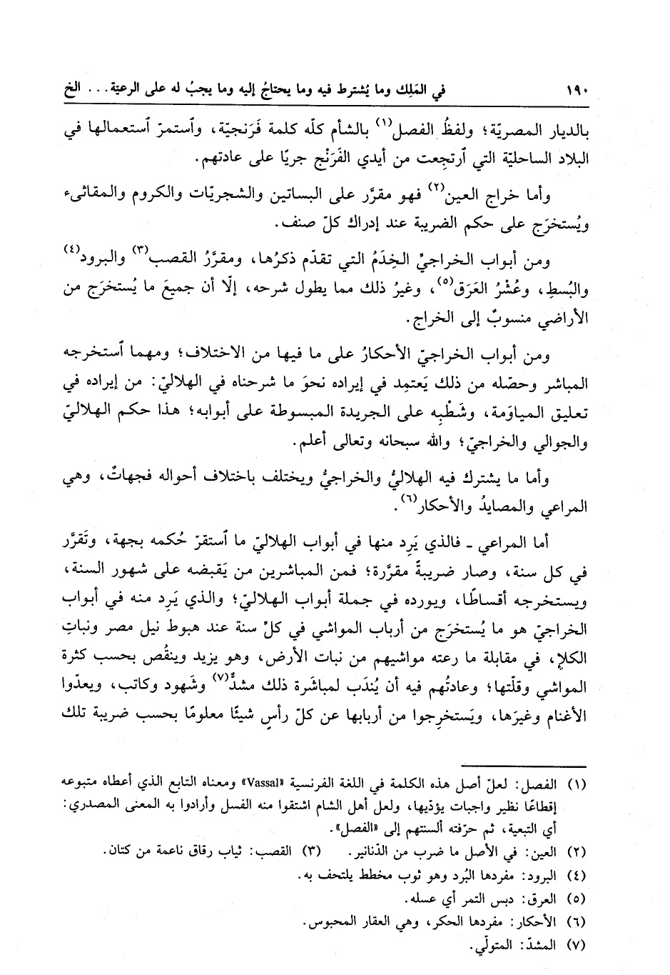 وأما ما يشترك فيه الهلالي والخراجي ويختلف باختلاف أحواله فجهاتٌ ، وهي المراعي والمصايد والأحكار ؛ أما المراعي - فالذي يرد منها في أبواب الهلالي ما استقر حكمه بجهة ، وتقرر في كل سنة ، وصار ضريبةً مقررة ؛ فمن المباشرين من يقبضه على شهور السنة ، ويستخرجه أقساطا ، ويورده في جملة أبواب الهلالي ؛ والذي يرد منه في أبواب الخراجي هو ما يستخرج من أرباب المواشي في كل سنة عند هبوط نيل مصر ونبات الكلإ ، في مقابلة ما رعته مواشيهم من نبات الأرض ، وهو يزيد وينقص بحسب كثرة المواشي وقلتها ؛ وعادتهم فيه أن يندب لمباشرة ذلك مشد ؟ وشهود وكاتب ، ويعدوا الأغنام وغيرها ، ويستخرجوا من أربابها عن كل رأسٍ شيئا معلوما بحسب ضريبة تلك