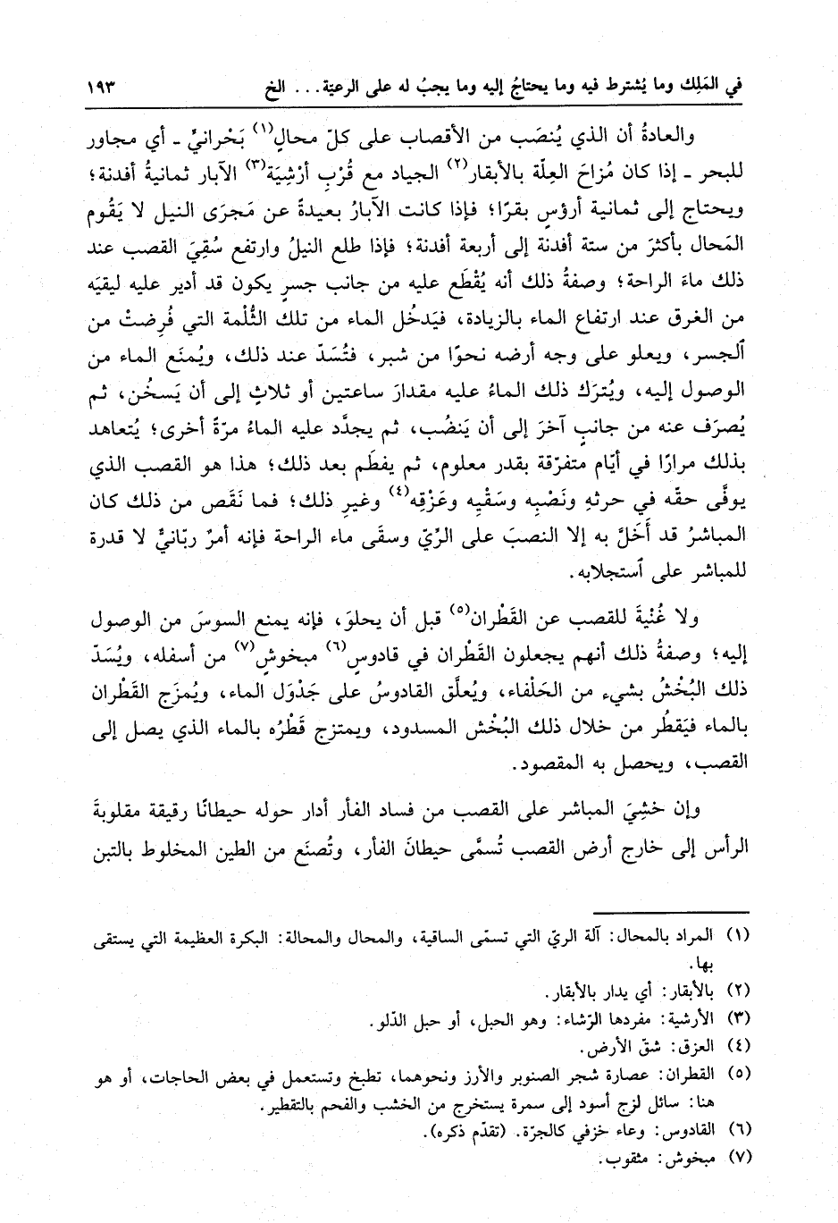 والعادة أن الذي ينصب من الأقصاب على كل مجالٍ بحراني ؟ - أي مجاور للبحر - إذا كان مزاح العلة بالأبقار الجياد مع قرب أرشية الآبار ثمانية أفدنة ؛ ويحتاج إلى ثمانية أرؤسٍ بقرا ؛ فإذا كانت الآبار بعيدةً عن مجرى النيل لا يقوم المحال بأكثر من ستة أفدنة إلى أربعة أفدنة ؛ فإذا طلع النيل وارتفع سقي القصب عند ذلك ماء الراحة ؛ وصفة ذلك أنه يقطع عليه من جانب جسرٍ يكون قد أدير عليه ليقيه من الغرق عند ارتفاع الماء بالزيادة ، فيدخل الماء من تلك الثلمة التي فرضت من الجسر ، ويعلو على وجه أرضه نحوا من شبر ، فتسد عند ذلك ، ويمنع الماء من الوصول إليه ، ويترك ذلك الماء عليه مقدار ساعتين أو ثلاثٍ إلى أن يسخن ، ثم يصرف عنه من جانبٍ آخر إلى أن ينضب ، ثم يجدد عليه الماء مرةً أخرى ؛ يتعاهد بذلك مرارا في أيام متفرقة بقدر معلوم ، ثم يفطم بعد ذلك ؛ فما نقص من ذلك كان المباشر قد أخل به إلا النصب على الري وسقى ماء الراحة فإنه أمرٌ رباني ؟ لا قدره للمباشر على استجلابه .