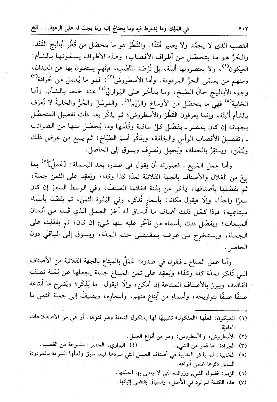 القصب الذي لا يجمد ولا يصير قندا . والقطر هو ما يتحصل من قطر أباليج القند . والحر هو ما يتحصل من أطراف الأقصاب ، وهذه الأطراف يسمونها بالشأم : العيكون ، ولا يعتصرونها ألبتة ، بل ترصد للنصب ، فإنهم يستغنون بها عن العيدان ، ومنهم من يسمى الحر المردودة . وأما الأسطروش : فهو ما يعمل من جرادة وجوه الأباليج حال الطبخ ، وما يتأحر على البواري عند خلعه بالشأم . وأما الخابية فهي ما يتحصل من الأوساخ والريم . والمرسل والحرو الخابية لا تعرف بالشأم ألبتة ، وإنما يعرفون القطر والأسطروش ؛ ثم يذكر بعد ذلك تفصيل المتحصل بجهاته إن كان بمصر - يفصل كل ساقية وفدنها وما يحصل منها من الضرائب - وتفصيل الأقصاب الرأس والخلفة ، ويذكر اسم الطباخ ؛ ثم يبيع من عرض ذلك ويثمن ، ويستقر بالجملة ، ويحمل ويصرف ويسوق إلى الحاصل .