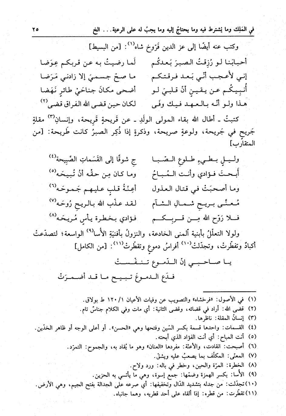 كتبت - أطال الله بقاء المولى الولد - عن قريحةٍ قريحه ، وإنسان مقلةٍ جريحٍ في جريحه ، ولوعةٍ صريحه ، وذكرةٍ إذا ذكر الصبر كانت طريحه