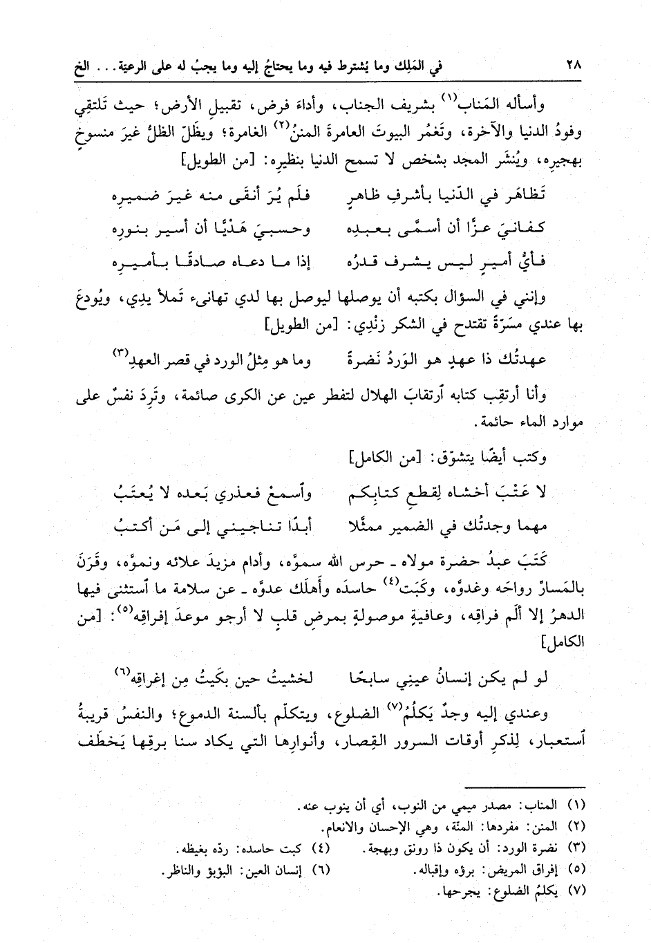وأسأله المناب بشريف الجناب ، وأداء فرض ، تقبيل الأرض ؛ حيث تلتقي وفود الدنيا والآخره ، وتغمر البيوت العامرة المنن الغامره ؛ يظل الظل غير منسوخٍ بهجيره ، وينشر المجد بشخص لا تسمح الدنيا بنظيره