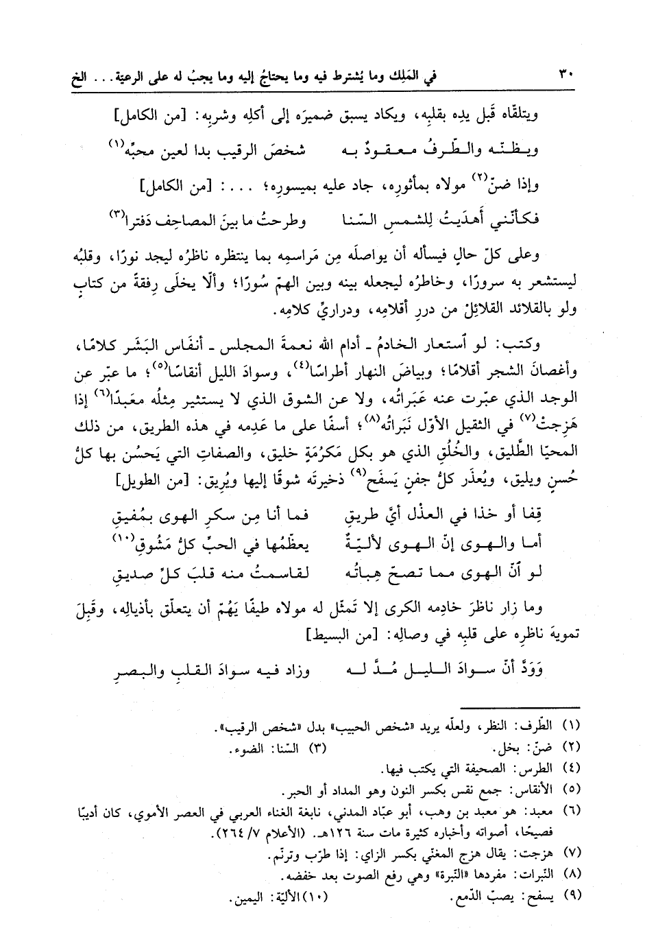 وعلى كل حالٍ فيسأله أن يواصله من مراسمه بما ينتظره ناظره ليجد نورا ، وقلبه ليستشعر به سرورا ، وخاطره ليجعله بينه وبين الهم سورا ؛ وألا يخلى رفقةً من كتابٍ ولو بالقلائد القلائل من درر أقلامه ، ودراري كلامه . وكتب : لو استعار الخادم - أدام الله نعمة المجلس - أنفاس البشر كلاما ، وأغصان الشجر أقلاما ؛ وبياض النهار أطراسا ، وسواد الليل أنقاسا ؛ ما عبر عن الوجد الذي عبرت عنه عبراته ، ولا عن الشوق الذي لا يستثيره مثله معبداً إذا هزجت في الثقيل الأول نبراته ؛ أسفا على ما عدمه في هذه الطريق ، من ذلك المحيا الطليق ، والخلق الذي هو بكل مكرمةٍ خليق ، والصفات التي يحسن بها كل حسنٍ ويليق ، ويعذر كل جفنٍ يسفح ذخيرته شوقا إليها ويريق