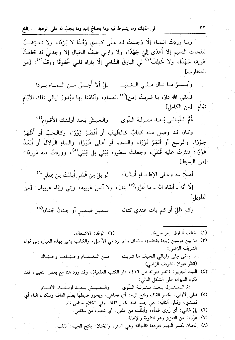 وما وردت الماء إلا وجدت له على كبدي وقداً لا بردا ، ولا تعرضت لنفحات النسيم إلا أهدى إلي جهدا ، ولا زارني طيف الخيال إلا وجدني قد قطعت طريقه سهدا ، ولا خطف لي البارق الشامي إلا باراه قلبي خفوقا ووقدا