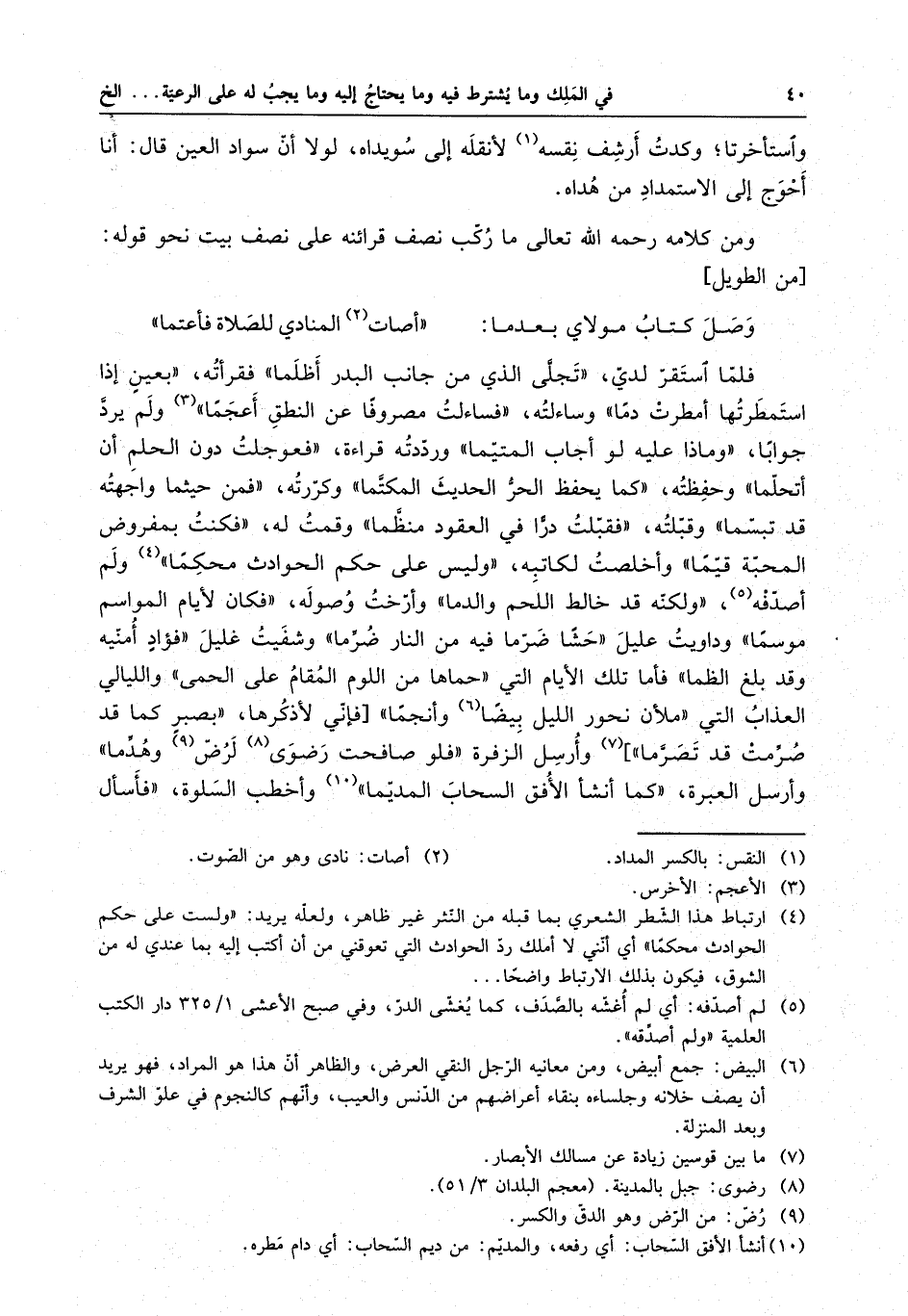 فلما استقر لدي ، " تجلى الذي من جانب البدر أظلما " فقرأته ، " بعينٍ إذا استمطرتها أمطرت دما " وسألته ، " فساءلت مصروفا عن النطق أعجما " ولم يرد جوابا ، " وماذا عليه لو أجاب المتيما " ورددته قراءة ، " فعوجلت دون الحلم أن أتحلما " وحفظته ، " كما يحفظ الحر الحديث المكتما " وكررته ، " فمن حيثما واجهته قد تبسما " وقبلته ، " فقبلت درا في العقود منظما " وقمت له ، " فكنت بمفروض المحبة قيما " وأخلصت لكاتبه ، " وليس على حكم الحوادث محكما " ولم أصدفه ، " ولكنه قد خالط اللحم والدما " وأزخت وصوله ، " فكان لأيام المواسم موسما " وداويت عليل " حشا ضر ما فيه من النار ضرما " وشفيت غليل " فؤادٍ أمنيه وقد بلغ الظما " فأما تلك الأيام التي " حماها من اللوم المقام على الحمى " والليالي العذاب التي " ملأن نحور الليل بيضا وأنجما " فإني لأذكرها ، " بصبرٍ كما قد صرمت قد تصرما " وأرسل الزفره " فلو صافحت رضوى لرض وهدما " وأرسل العبره ، " كما أنشأ الأفق السحاب مديما " وأخطب السلوه ، " فأسأل