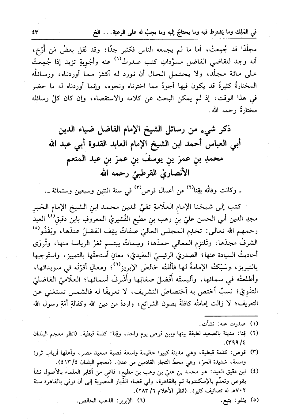 ذكر شيء من رسائل الشيخ الإمام الفاضل ضياء الدين أبي العباس أحمد ابن الشيخ الإمام العابد القدوة أبي عبد الله محمد بن عمر بن يوسف بن عمر بن عبد المنعم الأنصاري القرطبي رحمه الله