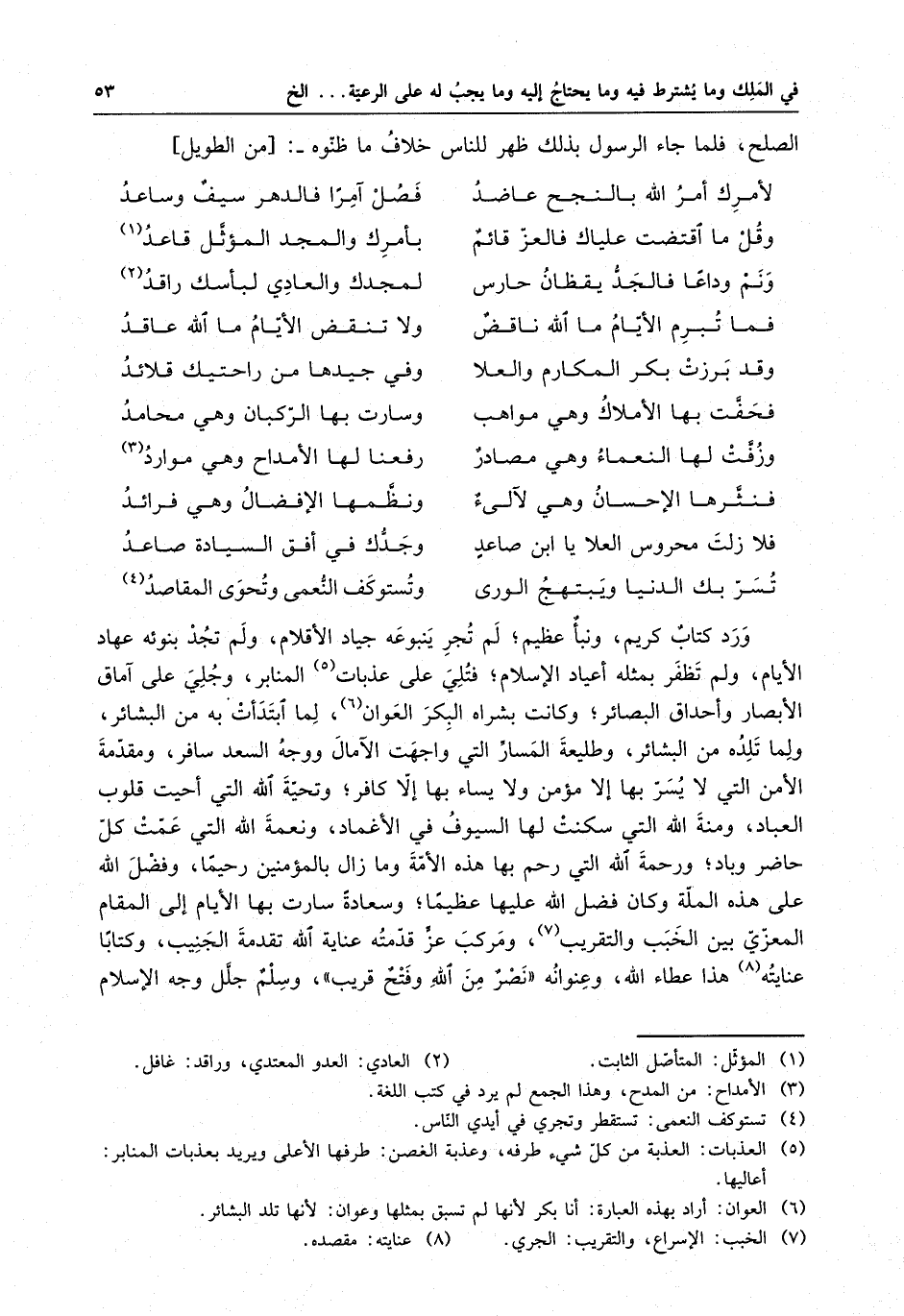 تسر بك الدنيا ويبتهج الورى . . . وتستوكف النعمى وتحوى المقاصد ورد كتابٌ كريم ، ونبأٌ عظيم ؛ لم تجر ينبوعه جياد الأقلام ، ولم تجد بنوئه عهاد الأيام ، ولم تظفر بمثله أعياد الإسلام ؛ فتلي على عذبات المنابر ، وجلي على آماق الأبصار وأحداق البصائر ؛ وكانت بشراه البكر العوان ، لما ابتدأت به من البشارة ولما تلده من البشائر ، وطليعة المسار التي واجهت الآمال ووجه السعد سافر ، ومقدمة الأمن التي لا يسر بها إلا مؤمن ولا يساء بها إلا كافر ؛ وتحية الله التي أحيت قلوب العباد ، ومنة الله التي سكنت لها السيوف في الأغماد ، ونعمة الله التي عمت كل حاضر وباد ؛ ورحمة الله التي رحم بها هذه الأمة وما زال بالمؤمنين رحيما ، وفضل الله على هذه الملة وكان فضل الله عليها عظيما ؛ وسعادةً سارت بها الأيام إلى المقام المعزى بين الخبب والتقريب ، ومركب عز ؟ قدمته عناية الله تقدمة الجنيب ، وكتاباً عنايته هذا عطاء الله ، وعنوانه " نصرٌ من الله وفتحٌ قريبٌ " ، وسلمٌ جلل وجه الإسلام