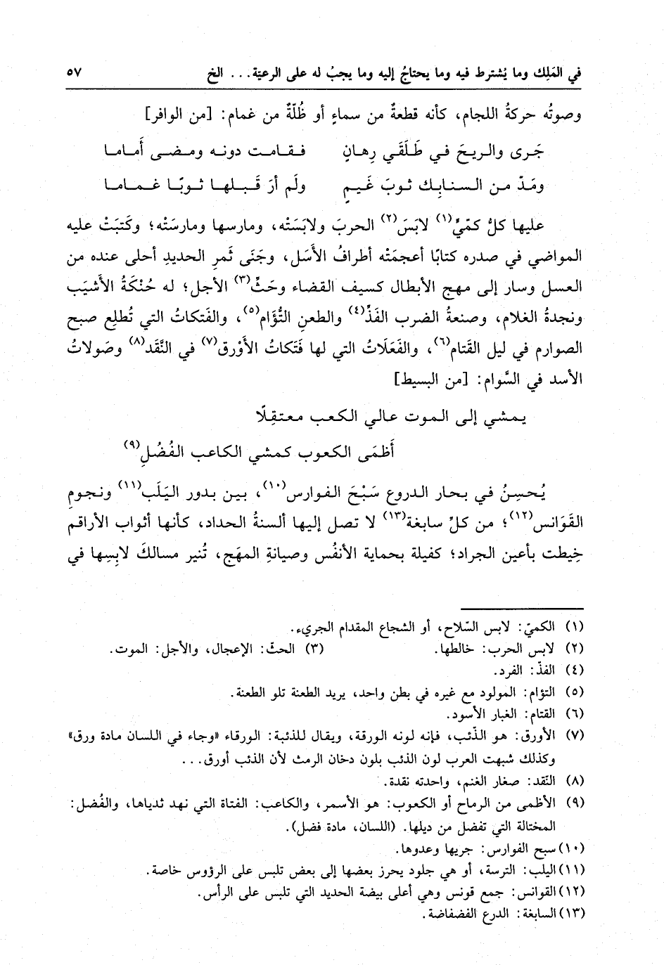 عليها كل كمى ؟ لابس الحرب ولابسته ، ومارسها ومارسته ؛ وكتبت عليه المواضي في صدره كتابا أعجمته أطراف الأسل ، وجنى ثمر الحديد أحلى عنده من العسل وسار إلى مهج الأبطال كسيف القضاء وحث الأجل ؛ له حنكة الأشيب ونجدة الغلام ، وصنعة الضرب الفذ والطعن التؤام ، والفتكات التي تطلع صبح الصوارم في ليل القتام ، والفعلات التي لها فتكات الأورقفي النقد وصولات الأسد في السوام