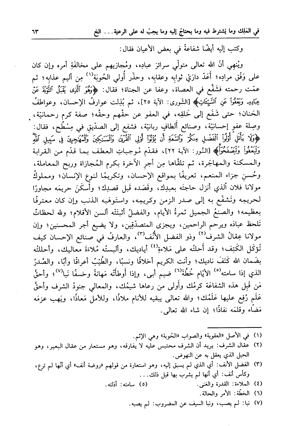 وكتب إليه أيضاً شفاعةً في بعض الأعيان فقال : وينهي أن الله تعالى متولى سرائر عباده ، ومجازيهم على مخالفة أمره وإن كان على وفق مراده ؛ أعد داري ثوابه وعقابه ، وحذر أولى العقوبة من أليم عذابه ؛ ثم عمت رحمته فشفع في العصاه ، وعفا عن الجناه ؛ فقال : " وهو الذي يقبل التوبة عن عباده ويعفو عن السيئات " ثم بذلت عوارف الإحسان ، وعواطف الحنان ؛ حتى شفع إلى خلقه ، في العفو عن حقهم وحقه ؛ صفة كرمٍ رحمانيه ، وصلة عفوٍ إحسانيه ، وصنائع ألطافٍ ربانيه ، فشفع إلى الصديق في مسطح ، فقال : " ولا يأتل أولوا الفضل منكم والسعة أن يؤتوا أولى القربى والمساكين والمهاجرين في سبيل الله وليعفوا وليصفحوا " فقدم موجبات العطف بما قدم من القرابة والمسكنة والمهاجرة ، ثم تلقاها من أجر الآخرة بكرم المجازاة وريح المعاملة ، وحسن جزاء المنعم ، تعريفا بمواقع الإحسان ، وتكريما لنوع الإنسان ؛ ومملوك مولانا فلان الذي أنزل حاجته بعبدك ، وقصده قبل قصدك ؛ وأسكن حريمه مجاورا لحريمه وتشفع به إلى صدر الزمن وكريمه ، واستوهبه الذنب وإن كان معترفا بعظيمه ؛ والصنع الجميل ثمرة الأيام ، والفضل أثبتته ألسن الأقلام ؛ ولله لحظاتٌ تلحظ عباده ويرحم الراحمين ، ويجزى المتصدقين ، ولا يضيع أجر المحسنين ؛ وإن مولانا عقال الشرف وذو الفضل الأنف ، والعارف في صنائع الإحسان كيف تؤكل الكتف ؛ وقد أحلته على ملاءة أياديك ، وألبسته ملاءة معاليك ، وأحللته بضمان الله كنف ناديك ؛ وأنت الكريم أخلاقا ونسبا ، والطيب أعراقا وأبا ، والصدر الذي إذا سامته الأيام خطة ضيم أبى ، وإذا أوطأته مهانةً وخسفا نبا ؛ وأحق من قبل هذه الشفاعة كرمك وأولى من رعاها شيمك ، والمعالي جنود الشرف وأحق علمٍ رفع عليها علمك ؛ والله تعالى يبقيه للأنام ملاذا ، وللأمل معاذا ، ويهب عزمه مضاء وقلمه نفاذا ؛ إن شاء الله تعالى .