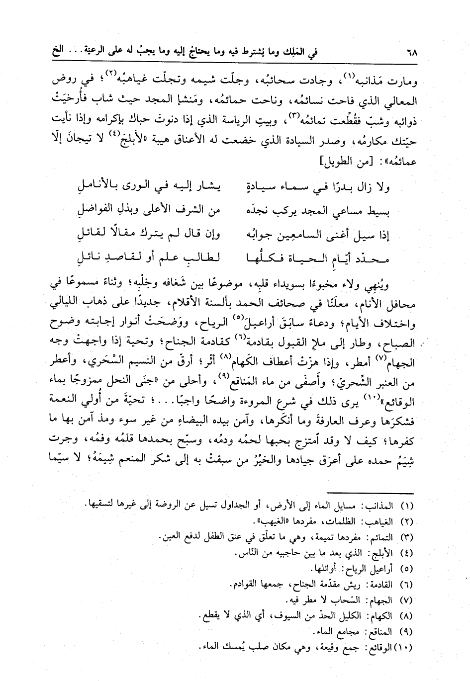 وينهى ولاء مخبوءا بسويداء قلبه ، موضوعا بين شغافه وخلبه ؛ وثناءً مسموعا في محافل الأنام ، معلنا في صحائف الحمد بألسنة الأقلام ، جديدا على ذهاب الليالي واختلاف الأيام ؛ ودعاءً سابق أراعيل الرياح ، ووضحت أنوار إجابته وضوح الصباح ، وطار إلى ملإ القبول بقادمة كقادمة الجناح ؛ وتحية إذا واجهت وجه الجهام أمطر ، وإذا هزت أعطاف الكهام أثر ؛ أرق من النسيم السحري ، وأعطر من العنبر الشحري ؛ وأصفى من ماء المناقع ، وأحلى من جنى النحل ممزوجا بماء الوقائع يرى ذلك في شرع المروءة واضحا واجبا . . . ؛ تحية من أولى النعمة فشكرها وعرف العارفة وما أنكرها ، وآمن بيده البيضاء من غير سوء ومذ آمن بها ما كفرها ؛ كيف لا وقد امتزج بحبها لحمه ودمه ، وسبح بحمدها قلمه وفمه ، وجرت شيم حمده على أعرق جيادها والخير من سبقت به إلى شكر المنعم شيمه ؛ لا سيما