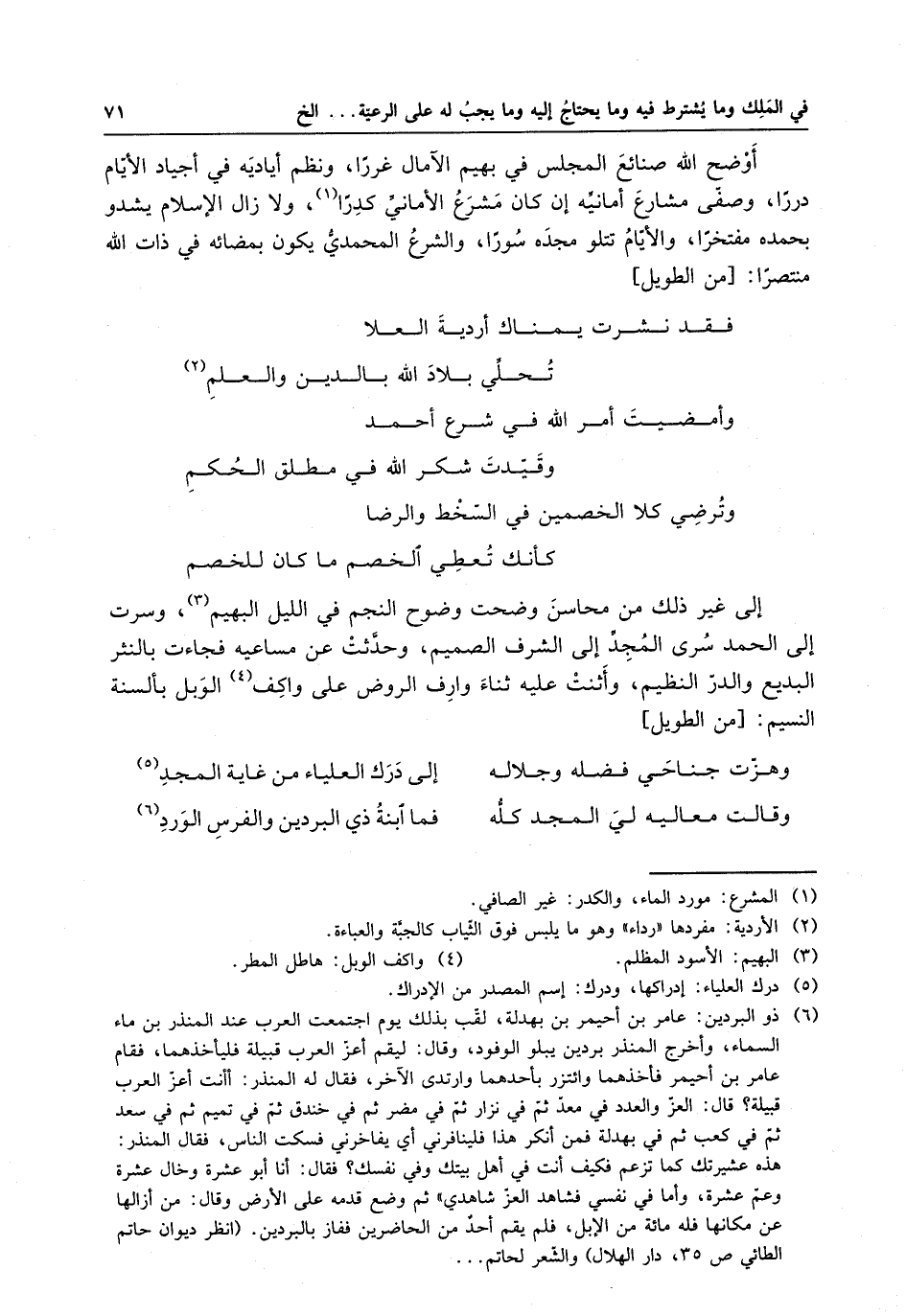 إلى غير ذلك من محاسن وضحت وضوح النجم في الليل البهيم ، وسرت إلى الحمد سرى المجد إلى الشرف الصميم ، وحدثت عن مساعيه فجاءت بالنثر البديع والدر النظيم ، وأثنت عليه ثناء وارف الروض على واكف الوبل بألسنة النسيم