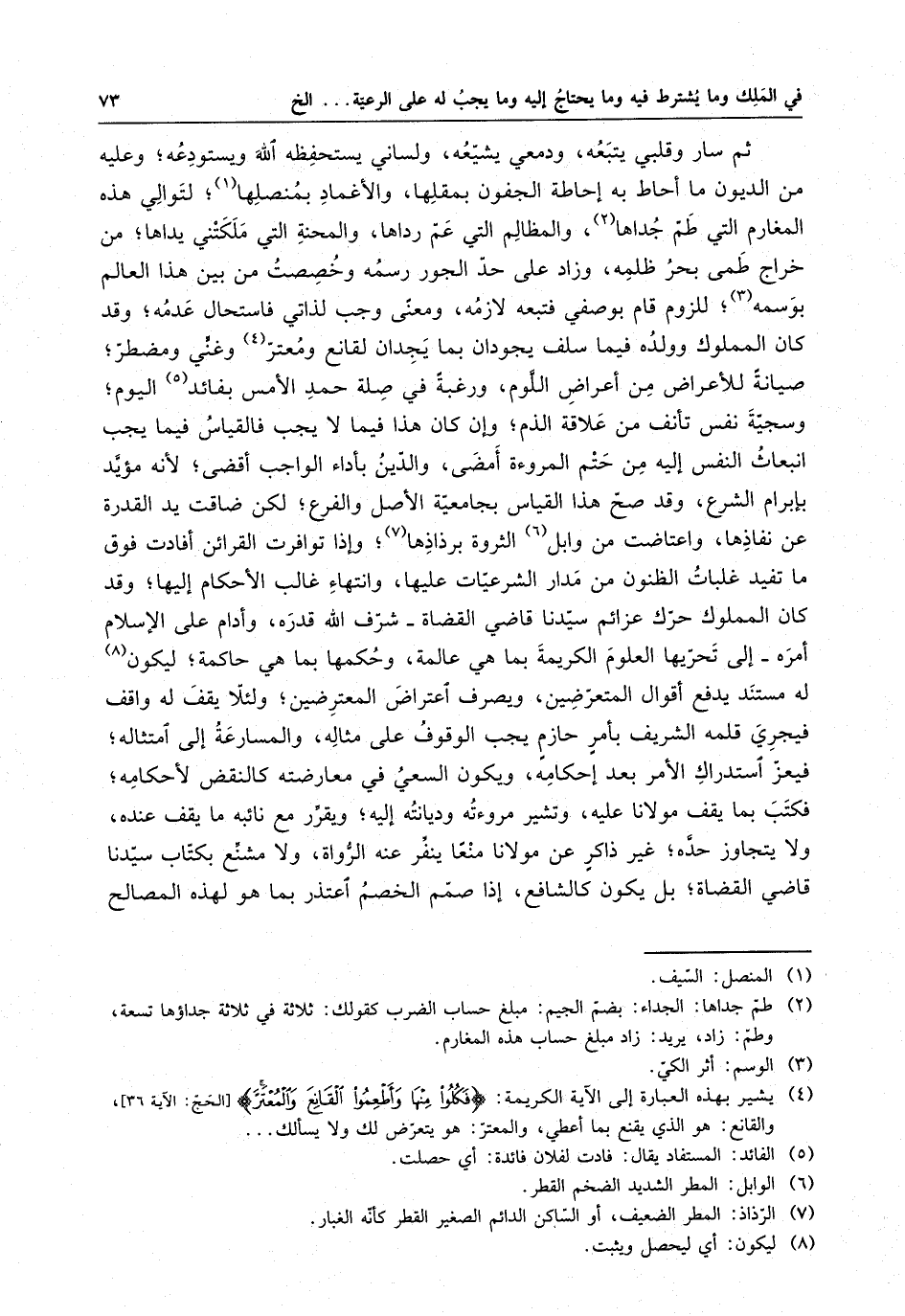 ثم سار وقلبي يتبعه ، ودمعه يشيعه ، ولساني يستحفظه الله ويستودعه ؛ وعليه من الديون ما أحاط به إحاطة الجفون بمقلها ، والأغماد بمنصلها ؛ لتوالي هذه المغارم التي طم جداها ، والمظالم التي عم رداها ، والمحنة التي ملكتني يداها ؛ من خراج طمى بحر ظلمه ، وزاد على حد الجور رسمه وخصصت من بين هذا العالم بوسمه ؛ للزومٍ قام بوصفي فتبعه لازمه ومعنىً وجب لذاتي فاستحال عدمه ؛ وقد كان المملوك وولده فيما سلف يجودان بما يجدان لقانع ومعتر ، وغني ؟ ومضطر ؛ صيانةً للأعراض من أعراض اللوم ، ورغبةً في صلة حمد الأمس بفائد اليوم ؛ وسجية نفس تأنف من علاقة الذم ؛ وإن كان هذا فيما لا يجب فالقياس فيما يجب انبعاث النفس إليه من حتم المروءة أمضى ، والدين بأداء الواجب أقضى ؛ لأنه مؤيد بإبرام الشرع ، وقد صح هذا القياس بجامعية الأصل والفرع ؛ لكن ضاقت يد القدرة عن نفاذها ، واعتاضت من وابل الثروة برذاذها ؛ وإذا توافرت القرائن أفادت فوق ما تفيد غلبات الظنون من مدار الشرعيات عليها ، وانتهاء غالب الأحكام إليها ؛ وقد كان المملوك حرك عزائم سيدنا قاضي القضاة - شرف الله قدره ، وأدام على الإسلام أمره - إلى تحريها العلوم الكريمة بما هي عالمه ، وحكمها بما هي حاكمه ؛ ليكون له مستند يدفع أقوال المتعرضين ، ويصرف اعتراض المعترضين ؛ ولئلا يقف له واقف فيجري قلمه الشريف بأمرٍ جازمٍ يجب الوقوف على مثاله ، والمسارعة إلى امتثاله ؛ فيعز استدراك الأمر بعد إحكامه ، ويكون السعي في معارضته كالنقض لأحكامه ؛ فكتب بما يقف عنده ، ولا يتجاوز حده ؛ غير ذاكرٍ عن مولانا منعا ينفر عنه الرواه ، ولا مشنع بكتاب سيدنا قاضي القضاه ؛ بل يكون كالشافع ، إذا صمم الخصم اعتذر بما هو لهذه المصالح