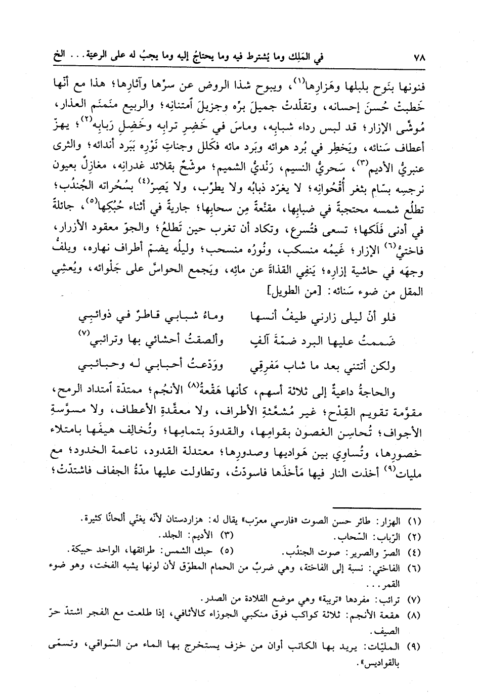 فنونها بنوح بلبلها هزارها ، ويبوح شذا الروض عن سرها وآثارها ؛ هذا مع أنها خطبت حسن إحسانه ، وتقلدت جميل بره وجزيل امتنانه ؛ والربيع منمنم العذار ، موشى الإزار ؛ قد لبس رداء شبابه ، وماس في خضر ترابه وخضل ربابه ؛ يهز أعطاف سنائه ، ويخطر في برد هوائه وبرد مائه ، فكلل وجنات نوره ببرد أندائه ؛ والثرى عنبري الأديم ، سحري النسيم ، رندي الشميم ؛ موشحٌ بقلائد غدرانه ، مغازلٌ بعيون نرجسه بسام بثغر أقحونه ؛ لا يغرد ذبابه ولا يطرب ، ولا يصر بسحراته الجندب ؛ تطلع شمسه محتجبةً في ضبابها ، مقنعةً من سحابها ؛ جاريةً في أثناء حبكها ، جائلةً في أدنى فلكها ؛ تسعى فتسرع ، وتكاد أن تغرب حين تطلع ؛ والجو معقود الأزرار ، فاختي الإزار ؛ غيمه منسكب ، ونوره منسحب ؛ وليله يضم أطراف نهاره ، ويلف وجهه في حاشية إزاره ؛ ينفي القذاة عن مائه ، ويجمع الحواس على جلوائه ، ويعشى المقل من ضوء سنائه