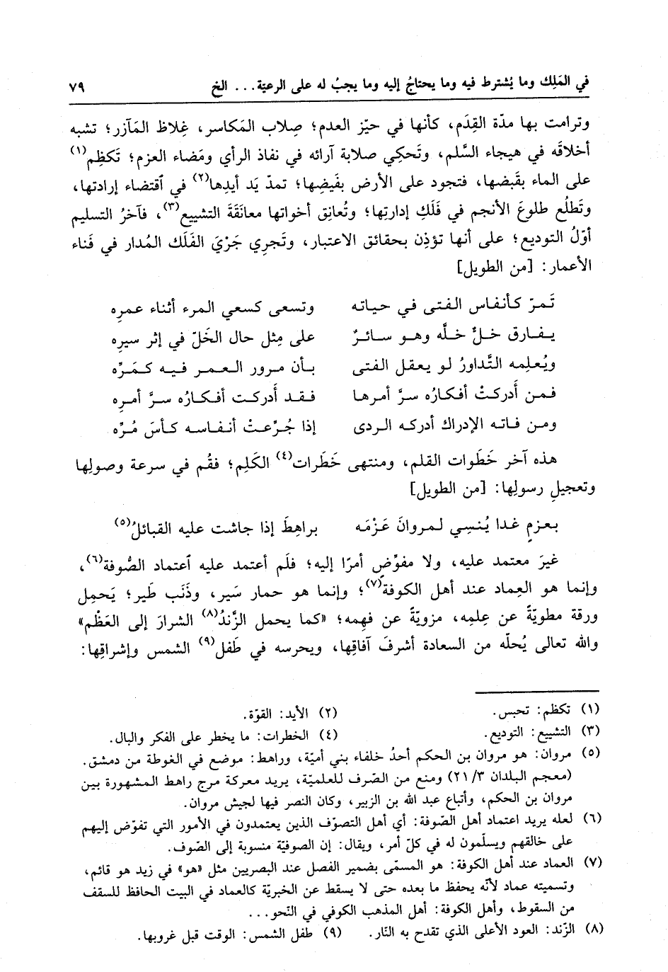 وترامت بها مدة القدم ، كأنها في حيز العدم ؛ صلاب المكاسر ، غلاظ المآزر ؛ تشبه أخلاقه في هيجاء السلم ، وتحكي صلابة آرائه في نفاذ الرأي ومضاء العزم ؛ تكظم على الماء بقبضها ، فتجود على الأرض بفيضها ؛ تمد يد أيدها في اقتضاء إرادتها ، وتطلع طلوع الأنجم في فلك إرادتها ؛ وتعانق أخواتها معانقة التشييع ؛ فآخر التسليم أول التوديع ؛ على أنها تؤذن بحقائق الاعتبار ، وتجري جري الفلك المدار في فناء الأعمار تمر كأنفاس الفتى في حياته . . . وتسعى كسعي المرء أثناء عمره
