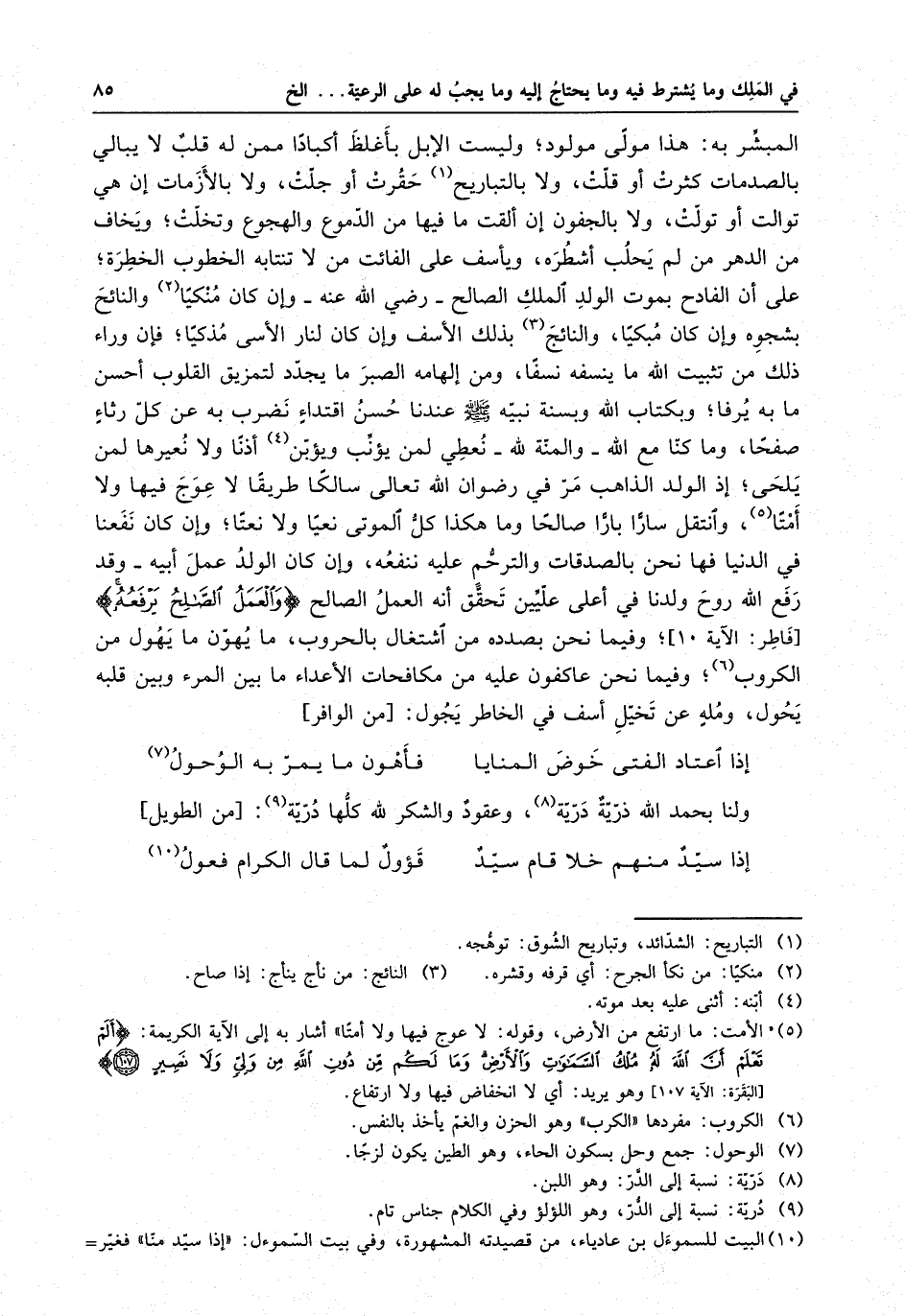 المبشر به : هذا مولىً مولود ؛ وليست الإبل بأغلظ أكبادا ممن له قلبٌ لا يبالي بالصدمات كثرت أو قلت ، ولا بالتباريح حقرت أو جلت ، ولا بالأزمات إن هي توالت أو تولت ، ولا بالجفون إن ألقت ما فيها من الدموع والهجوع وتخلت ؛ ويخاف من الدهر من لم يحلب أشطره ، ويأسف على الفائت من لا تنتابه الخطوب الخطره ؛ على أن الفادح بموت الولد الملك الصالح - رضي الله عنه - وإن كان منكيا والنائح بشجوه وإن كان مبكيا ، والنائج بذلك الأسف وإن كان لنار الأسى مذكيا ؛ فإن وراء ذلك من تثبيت الله ما ينسفه نسفا ، ومن إلهامه الصبر ما يجدد لتمزيق القلوب أحسن ما به يرفا ؛ وبكتاب الله وبسنة نبيه ( صلى الله عليه وسلم ) عندنا حسن اقتداء نضرب به عن كل رئاءٍ صفحا ، وما كنا مع الله - والمنة لله - نعطي لمن يؤنب ويؤبن أذنا ولا نعيرها لمن يلحى ؛ إذ الولد الذاهب مر في رضوان الله تعالى سالكا طريقا لا عوج فيها ولا أمتا ، وانتقل سارا بارا صالحا وما هكذا كل الموتى نعيا ولا نعتا ؛ وإن كان نفعنا في الدنيا فها نحن بالصدقات والترحم عليه ننفعه ، وإن كان الولد عمل أبيه - وقد رفع الله روح ولدنا في أعلى عليين تحقق أنه العمل الصالح " والعمل الصالح يرفعه " ؛ وفيما نحن بصدده من اشتغال بالحروب ، ما يهون ما يهول من الكروب ؛ وفيما نحن عاكفون عليه من مكافحات الأعداء ما بين المرء وبين قلبه يحول ، وملهٍ عن تخيل أسف في الخاطر يجول