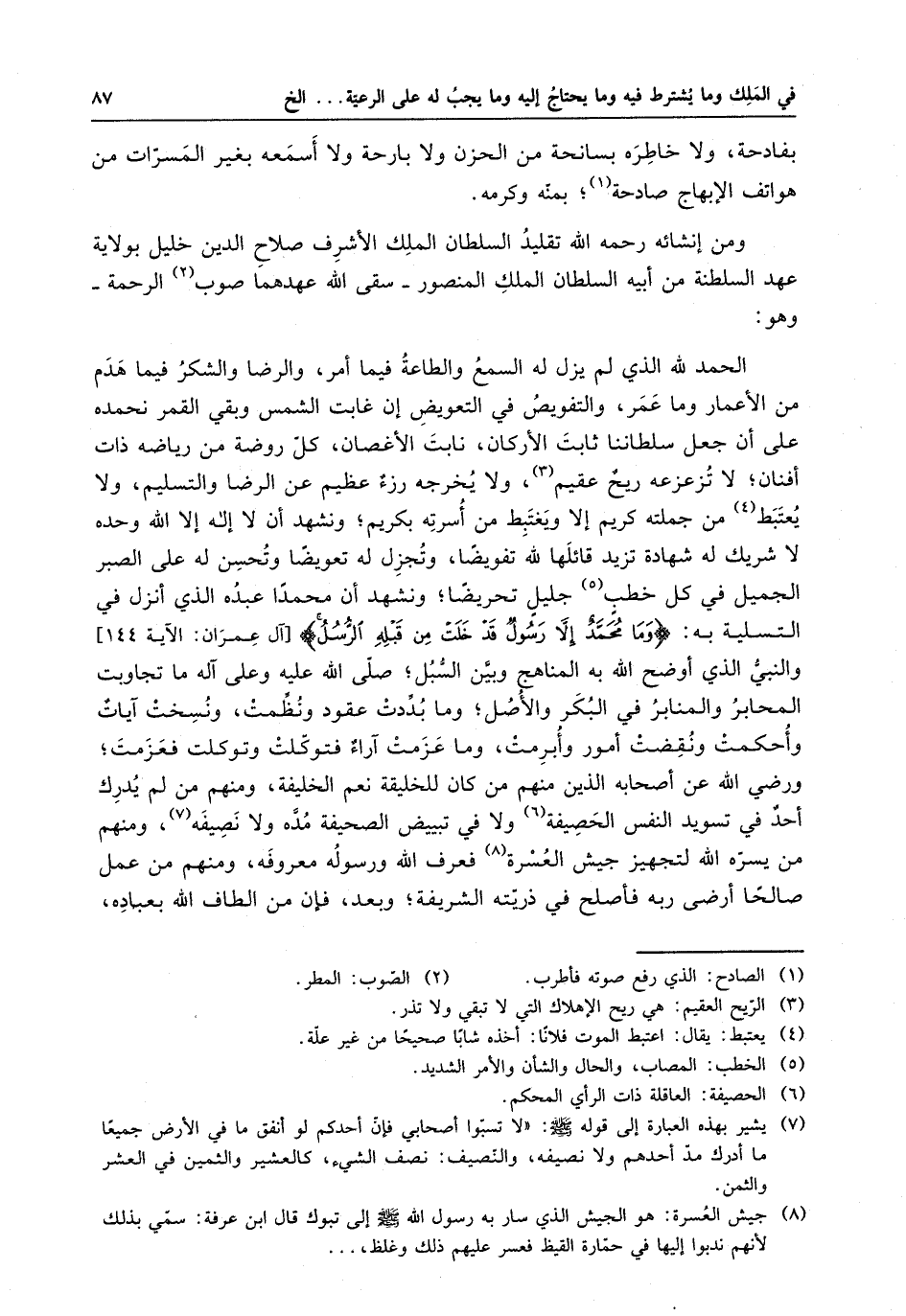 ومن إنشائه رحمه الله تقليد السلطان الملك الأشرف صلاح الدين خليل بولاية عهد السلطنة من أبيه السلطان الملك المنصور - سقى الله عهدهما صوب الرحمة - وهو : الحمد لله الذي لم يزل له السمع والطاعة فيما أمر ، والرضا والشكر فيما هدم من الأعمار وما عمر ، والتفويض إن غابت الشمس وبقى القمر نحمده على أن جعل سلطاننا ثابت الأركان ، نابت الأغصان ، كل رياضة من رياضه ذات أفنان ؛ لا تزعزعه ريحٌ عقيم ، ولا يخرجه رزءٌ عظيم عن الرضا والتسليم ، ولا يعتبط من جملته كريم إلا ويغتبط من أسرته بكريم ؛ ونشهد أن لا إله إلا الله وحده لا شريك له شهادة تزيد قائلها لله تفويضا ، وتجزل له تعويضا وتحسن له على الصبر الجميل في كل خطبٍ جليلٍ تحريضا ؛ ونشهد أن محمدا عبده الذي أنزل في التسلية به : " وما محمدٌ إلا رسولٌ قد خلت من قبله الرسل " والنبي الذي أوضح الله به المناهج وبين السبل ؛ صلى الله عليه وعلى آله ما تجاوبت المحابر والمنابر في البكر والأصل ؛ وما بددت عقود ونظمت ، ونسخت آياتٌ وأحكمت ونقضت أمور وأبرمت ، وما عزمت آراءٌ فتوكلت وتوكلت فعزمت ؛ ورضي الله عن أصحابه الذين منهم من كان للخليقة نعم الخليفة ، ومنهم من لم يدرك أحدٌ في تسويد النفس الحصيفة ولا في تبييض الصحيفة سمده ولا نصيفه ، ومنهم من يسره الله لتجهيز جيش العسرة فعرف الله ورسوله معروفه ، ومنهم من عمل صالحا أرضى ربه فأصلح في ذريته الشريفه ؛ وبعد ، فإن من ألطاف الله بعباده ،