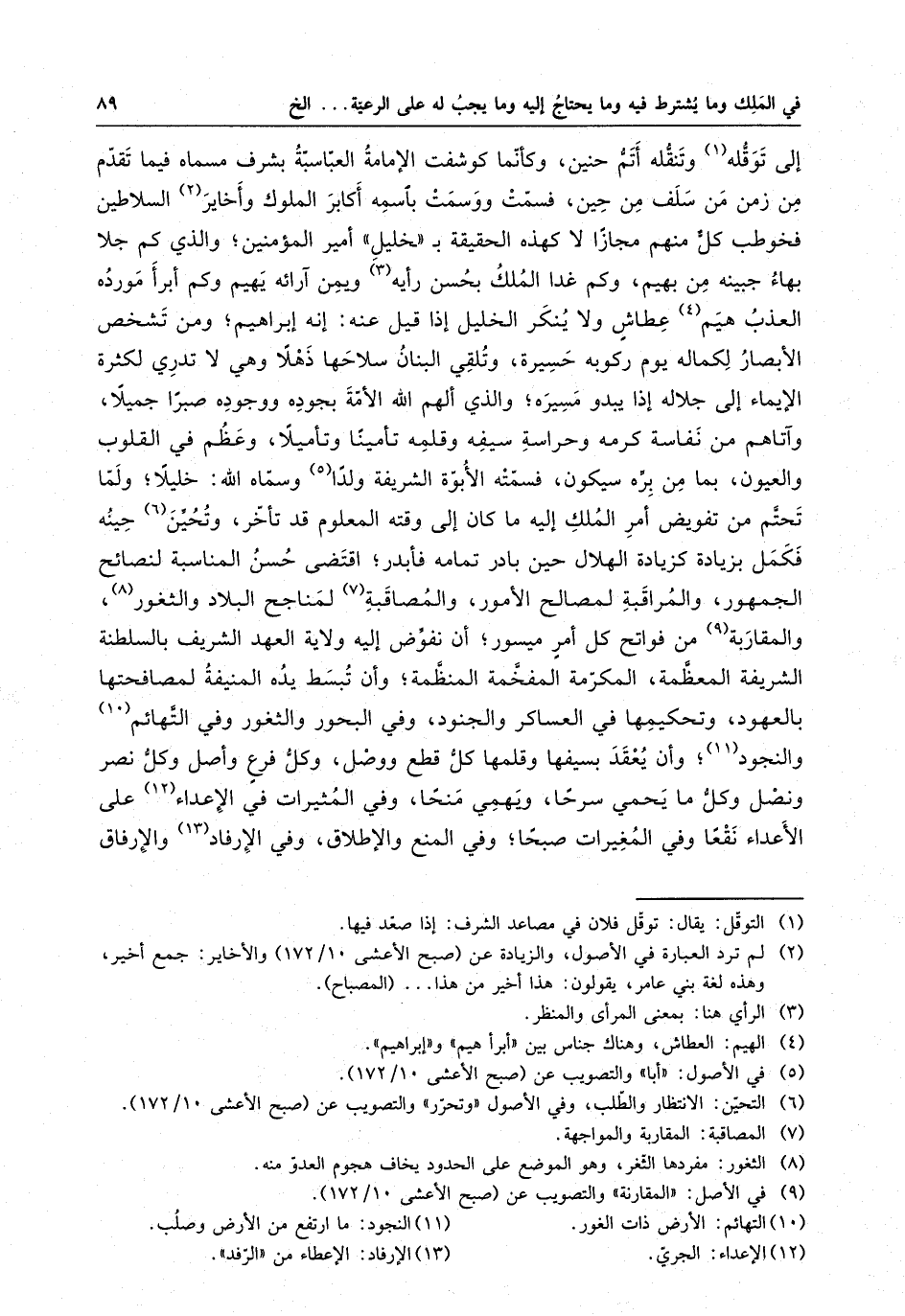 إلى توقله وتنقله أتم حنين ، وكأنما كوشفت الإمامة العباسية بشرف مسماه فيما تقدم من زمن من سلف من حين ، فسمت ووسمت باسمه أكابر الملوك وأخاير السلاطين فخوطب كل ؟ منهم مجازا لا كهذه الحقيقة بخليل أمير المؤمنين ؛ والذي كم جلا بهاء جبينه من بهيم ، وكم غدا الملك بحسن رأيه ويمن آرائه يهيم وكم أبرأ مورده العذب هيم عطاشٍ ولا ينكر الخليل إذا قيل عنه : إنه إبراهيم ؛ ومن تشخص الأبصار لكماله يوم ركوبه حسيره ، وتلقي البنان سلاحها ذهلا وهي لا تدري لكثرة الإيماء إلى جلاله إذا يبدو مسيره ؛ والذي ألهم الله الأمة بجوده ووجوده صبرا جميلا ، وآتاهم من نفاسة كرمه وحراسة سيفه وقلمه تأمينا وتأميلا ، وعظم في القلوب والعيون ، بما من بره سيكون ، فسمته الأبوة الشريفة ولدا وسماه الله : خليلا ؛ ولما تحتم من تفويض أمر الملك إليه ما كان إلى وقته المعلوم قد تأخر ، وتحين حينه فكمل بزيادة كزيادة الهلال حين بادر تمامه فأبدر ؛ اقتضى حسن المناسبة لنصائح الجمهور ، والمراقبة لمصالح الأمور ، والمصاقبة لمناجح البلاد والثغور ، والمقاربة سمن فواتح كل أمرٍ ميسور ؛ أن نفوض إليه ولاية العهد الشريف بالسلطنة الشريفة المعظمه ، المكرمة المفخمة المنظمه ؛ وأن تبسط يده المنيفة لمصافحتها بالعهود ، وتحكيمها في العساكر والجنود ، وفي البحور والثغور وفي التهائم والنجود ؛ وأن يعقد بسيفها وقلمها كل قطع ووصل ، وكل فرعٍ وأصل وكل نصر ونصل ؛ وكل ما يحمى سرحا ، ويهمى منحا ، وفي المثيرات في الإعداء على الأعداء نقعا وفي المغيرات صبحا ؛ وفي المنع والإطلاق ، وفي الإرفاد والإرفاق
