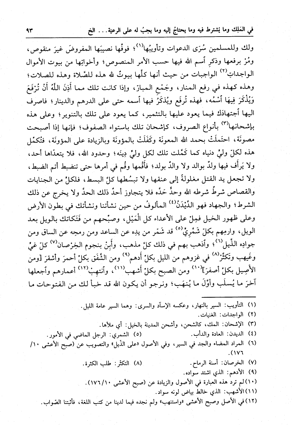 ولك وللمسلمين سرى الدعوات وتأويبها ؛ فوفها نصيبها المفروض غير منقوص ، ومر برفعها وذكر اسم الله فيها حسب الأمر المنصوص ؛ وأخواتها من بيوت الأموال الواجدات الواجبات من حيث أنها كلها بيوتٌ لله هذه للصلاة وهذه للصلات ، وهذه كهذه في رفع المنار ، وجمع المبار ، وإذا كانت تلك مما أذن الله أن ترفع ويذكر فيها اسمه ، فهذه ترفع ويذكر فيها اسمه حتى على الدرهم والدينار ؛ فاصرف إليها اجتهادك فيما يعود عليها بالتثمير ، كما يعود على تلك بالتنوير ؛ وعلى هذه بإشحانها بأنواع الصروف ، كإشحان تلك باستواء الصفوف ؛ فإنها إذا أصبحت مصونه ، احتملت بحمد الله المعونه وكفلت بالمؤونة وبالزيادة على المؤونه ، فتكمل هذه لكل ولي ؟ دنياه كما كملت تلك لكل ولي ؟ دينه ؛ وحدود الله ، فلا يتعداها أحد ، ولا يرأف فيها ولدٌ بوالد ولا والدٌ بولد ؛ فأقمها وقم في أمرها حتى تنضبط أتم الضبط ، ولا تجعل يد القتل مغلولةً إلى عنقها ولا تبسطها كل البسط ، فلكل ؟ من الجنايات والقصاص شرطٌ شرطه الله وحد ؟ حده فلا يتجاوز أحدٌ ذلك الحد ولا يخرج عن ذلك الشرط ؛ والجهاد فهو الديدن المألوف من حين نشأتنا ونشأتك في بطون الأرض وعلى ظهور الخيل فمل على الأعداء كل الميل ، وصبحهم من فتكاتك بالويل بعد الويل ، وارمهم بكل شمري ؟ قد شمر من يده عن الساعد ومن رمحه عن الساق ومن جواده الذيل ؛ واذهب بهم في ذلك كل مذهب ، وأبن بنجوم الخرصان كل غي ؟ وغيهب وتكثر في غزوهم من الليل بكل أدهم ومن الشفق بكل أحمر وأشقر ومن الأصيل بكل أصفر ومن الصبح بكل أشهب ، وانتهب أعمارهم واجعلها آخر ما يسلب وأول ما ينهب ؛ ونرجوا أن يكون الله قد خبأ لك من الفتوحات ما