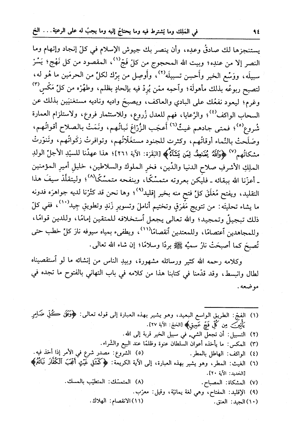 يستنجزها لك صادق وعده ، وأن ينصر بك جيوش الإسلام في كل إنجاد وإتهام وما النصر إلا من عنده ؛ وبيت الله المحجوج من كل فج ، المقصود من كل نهج ؛ يسر سبيله ، ووسع الخير وأحسن تسبيله ، وأوصل من برك لكل ؟ من الحرمين ما هو له ، لتصبح ربوعه بذلك مأهوله ؛ واحمه ممن يرد فيه بإلحادٍ بظلم ، وطهره من كل مكسٍ وغرم ؛ ليعود نفعك على البادي والعاكف ، ويصبح واديه وناديه مستغنين بذلك عن السحاب الواكف ؛ والرعايا ، فهم للعدل زروع ، وللاستثمار فروع ، ولاسلتزام العمارة شروع ؛ فمتى جادهم غيثٌ أعجب الزراع نباتهم ، ونمت بالصلاح أقواتهم ، وصلحت بالنماء أوقاتهم ، وكثرت للجنود مستغلاتهم ، وتوافرت زكواتهم ، وتنورت مشكاتهم " والله يضاعف لمن يشاء " ؛ هذا عهدنا للسيد الأجل الولد الملك الأشرف صلاح الدنيا والدين ، فخر الملوك والسلاطين ، خليل أمير المؤمنين - أعزنا الله ببقائه - فليكن بعروته متمسكا ، وبنفحته متمسكا ؛ وليتقلد سيف هذا التقليد ، ويفتح مغلق كل فتحٍ منه بخير إقليد ، وها نحن قد كثرنا لديه جواهره فدونه ما يشاء تحليته : من تتويج مفرقٍ وتخنيم أنامل وتسوير زندٍ وتطويق جيد ، ففي كل ذلك تبجيلٌ وتمجيد ؛ والله تعالى يجعل استخلافه للمتقين إمام ، وللدين قواما ، وللمجاهدين اعتصاما ، وللمعتدين انفصاما ، ويطفئ بمياه سيوفه نار كل خطب حتى تصبح كما أصبحت نار سميه ( صلى الله عليه وسلم ) بردا وسلاما ؛ إن شاء الله تعالى . لت بالمؤونة وبالزيادة على المؤونه ، فتكمل هذه لكل ولي ؟ دنياه كما كملت تلك لكل ولي ؟ دينه ؛ وحدود الله ، فلا يتعداها أحد ، ولا يرأف فيها ولدٌ بوالد ولا والدٌ بولد ؛ فأقمها وقم في أمرها حتى تنضبط أتم الضبط ، ولا تجعل يد القتل مغلولةً إلى عنقها ولا تبسطها كل البسط ، فلكل ؟ من الجنايات والقصاص شرطٌ شرطه الله وحد ؟ حده فلا يتجاوز أحدٌ ذلك الحد ولا يخرج عن ذلك الشرط ؛ والجهاد فهو الديدن المألوف من حين نشأتنا ونشأتك في بطون الأرض وعلى ظهور الخيل فمل على الأعداء كل الميل ، وصبحهم من فتكاتك بالويل بعد الويل ، وارمهم بكل شمري ؟ قد شمر من يده عن الساعد ومن رمحه عن الساق ومن جواده الذيل ؛ واذهب بهم في ذلك كل مذهب ، وأبن بنجوم الخرصان كل غي ؟ وغيهب وتكثر في غزوهم من الليل بكل أدهم ومن الشفق بكل أحمر وأشقر ومن الأصيل بكل أصفر ومن الصبح بكل أشهب ، وانتهب أعمارهم واجعلها آخر ما يسلب وأول ما ينهب ؛ ونرجوا أن يكون الله قد خبأ لك من الفتوحات ما يستنجزها لك صادق وعده ، وأن ينصر بك جيوش الإسلام في كل إنجاد وإتهام وما النصر إلا من عنده ؛ وبيت الله المحجوج من كل فج ، المقصود من كل نهج ؛ يسر سبيله ، ووسع الخير وأحسن تسبيله ، وأوصل من برك لكل ؟ من الحرمين ما هو له ، لتصبح ربوعه بذلك مأهوله ؛ واحمه ممن يرد فيه بإلحادٍ بظلم ، وطهره من كل مكسٍ وغرم ؛ ليعود نفعك على البادي والعاكف ، ويصبح واديه وناديه مستغنين بذلك عن السحاب الواكف ؛ والرعايا ، فهم للعدل زروع ، وللاستثمار فروع ، ولاسلتزام العمارة شروع ؛ فمتى جادهم غيثٌ أعجب الزراع نباتهم ، ونمت بالصلاح أقواتهم ، وصلحت بالنماء أوقاتهم ، وكثرت للجنود مستغلاتهم ، وتوافرت زكواتهم ، وتنورت مشكاتهم " والله يضاعف لمن يشاء " ؛ هذا عهدنا للسيد الأجل الولد الملك الأشرف صلاح الدنيا والدين ، فخر الملوك والسلاطين ، خليل أمير المؤمنين - أعزنا الله ببقائه - فليكن بعروته متمسكا ، وبنفحته متمسكا ؛ وليتقلد سيف هذا التقليد ، ويفتح مغلق كل فتحٍ منه بخير إقليد ، وها نحن قد كثرنا لديه جواهره فدونه ما يشاء تحليته : من تتويج مفرقٍ وتخنيم أنامل وتسوير زندٍ وتطويق جيد ، ففي كل ذلك تبجيلٌ وتمجيد ؛ والله تعالى يجعل استخلافه للمتقين إمام ، وللدين قواما ، وللمجاهدين اعتصاما ، وللمعتدين انفصاما ، ويطفئ بمياه سيوفه نار كل خطب حتى تصبح كما أصبحت نار سميه ( صلى الله عليه وسلم ) بردا وسلاما ؛ إن شاء الله تعالى . وكلامه رحمه الله كثير ورسائله مشهورة ، وبيد الناس من إنشائه ما لو استقصيناه لطال وانبسط ، وقد قدمنا في كتابنا هذا من ك