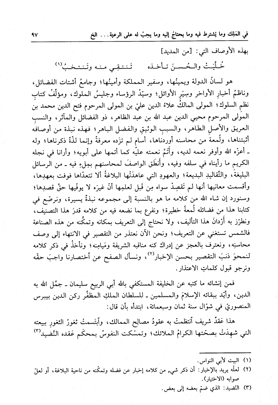 خليت والحسن تأخذه . . . تنتقي منه وتنتخب هو لسان الدولة ويمينها ، وسفير المملكة وأمينها ؛ وجامع أشتات الفضائل ، وناظم أخبار الأواخر وسير الأوائل ؛ وسيد الرؤساء وجليس الملوك ، ومؤلف كتاب نظم السلوك ؛ المولى المالك علاء الدين علي ابن المولى المرحوم فتح الدين محمد ابن المولى المرحوم محيي الدين عبد الله بن عبد الظاهر ، ذو الفضائل والمآثر ، والنسب العريق والأصل الطاهر ، والسبب الوثيق والفضل الباهر ؛ فهذه نبذة من أوصافه أثبتناها ، ولمعة من محاسنه أوردناها ، أسامٍ لم تزده معرفةً وإنما لذةً ذكرناها ؛ وله - أعزه الله وأوفر نعمه لديه ، وأتم نعمته عليه كما أتمها على أبويه ؛ وأرانا في نجله الكريم ما رأيناه في سلفه وفيه ، وأنطق الواصف لمحاسنهم بملء فيه - من الرسائل البليغه ، والتقاليد البديعه ؛ والعهود التي عاهدتها البلاغة ألا تتعداها فوفت بعهدها ، وأقسمت معانيها أنها لم تقصد سواه من قبل لعلمها أن غيره لا يوفيها حق قصدها ؛ وسنورد إن شاء الله من كلامه ما هو بالنسبة إلى مجموعة نبذةٌ يسيره ، ونرصع في كتابنا هذا من فضائله لمعةً خطيره ؛ ونرفع بما نضعه فيه من كلامه قدر هذا التصنيف ، ونطرز به أردان هذا التأليف ، ولا نحتاج إلى التعريف بماكنه وتمكنه من هذه الصناعة فالشمس تستغني عن التعريف ؛ ونح الآن نعتذر من التقصير في الانتهاء إلى وصف محاسنه ، ونعترف بالعجز عن إدراك كنه مناقبه الشريفة وميامنه ؛ ونأخذ في ذكر كلامه لنمحو ذنب التقصير بحسن الإخبار ، ونسأل الصفح عن اختصارنا واجب حقه ونرجوا قبول كلمات الاعتذار فم إنشائه ما كتبه عن الخليفة المستكفي بالله أبي الربيع سليمان - جمل الله به الدين ، وأيد ببقائه الإسلام والمسلمين - للسلطان الملك المظفر ركن الدين بيبرس المنصوري في شوال سنة ثمان وسبعمائة ، ابتدأه بأن قال : هذا عقودٌ شريف انتظمت به عقود مصالح الممالك ، وابتسمت ثغور الثغور ببيعته التي شهدت بصحتها الكرام الملائك ؛ وتمسكت النفوس بمحكم عقده النضيد