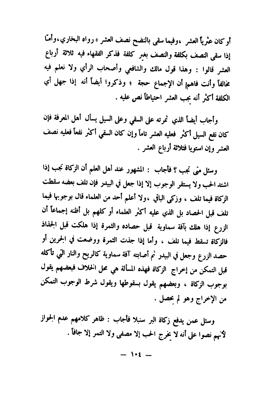 أو كان عثرياً: العشر، وفيما سقي بالنضح: نصف العشر " 1، رواه البخاري. وأما إذا سقي النصف بكلفة والنصف بغير كلفة، فذكر الفقهاء فيه ثلاثة أرباع العشر، قالوا: وهذا قول مالك والشافعي وأصحاب الرأي، ولا نعلم فيه مخالفاً. وأنت فاهم أن الإجماع حجة. وذكروا أيضاً أنه إذا جهل أي الكلفة أكثر، أنه يجب العشر احتياطاً، نص عليه.