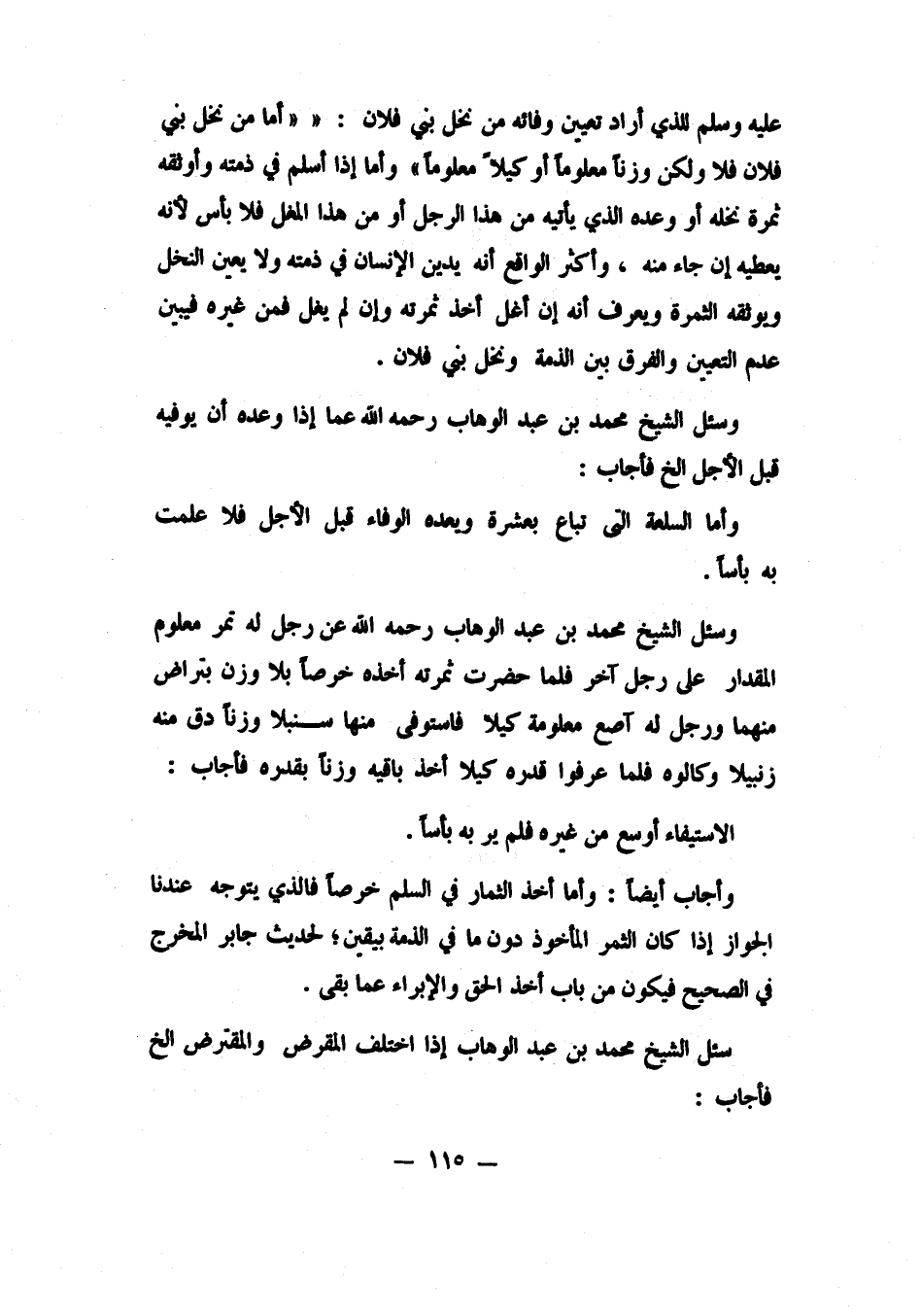وسئل الشيخ محمد بن عبد الوهاب، رحمه الله: عن رجل له تمر معلوم المقدار على رجل آخر، فلما حضرت ثمرته أخذه خرصًا بلا وزن، بتراض منهما، ورجل له آصع معلومة كيلاً فاستوفى منها سنبلاً وزنًا، دق منه زنبيلاً وكالوه، فلما عرفوا قدره كيلاً أخذ باقيه وزنًا بقدره؟